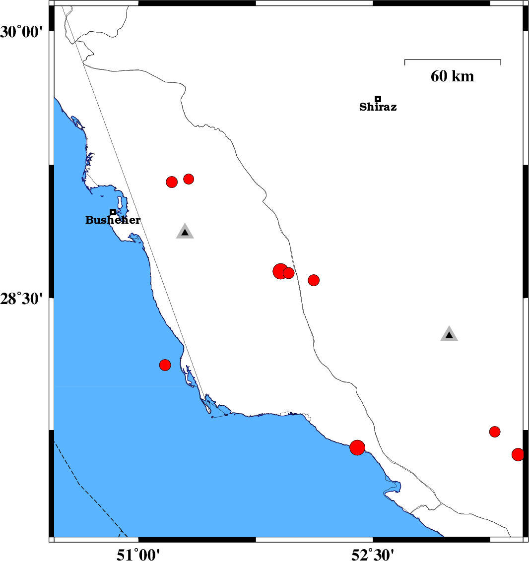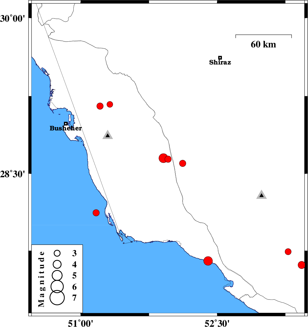 | 2020/07/21 | 12:26:17.5 | 16:56:17.5 | 29.154 | 51.212 | 12 | ML:3.3 | Bushehr Province, 12 km South of Borazjan | ||