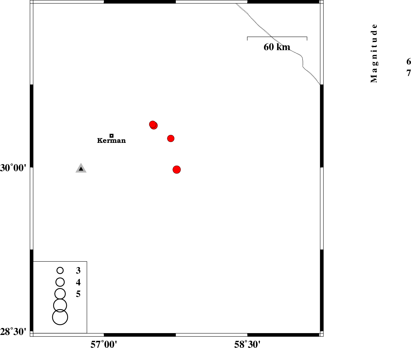 2020/08/22 | 06:52:54.9 | 11:22:54.9 | 30.38 | 57.52 | 10 | ML:3.5 | Kerman Province, 44 km -East of Kerman |