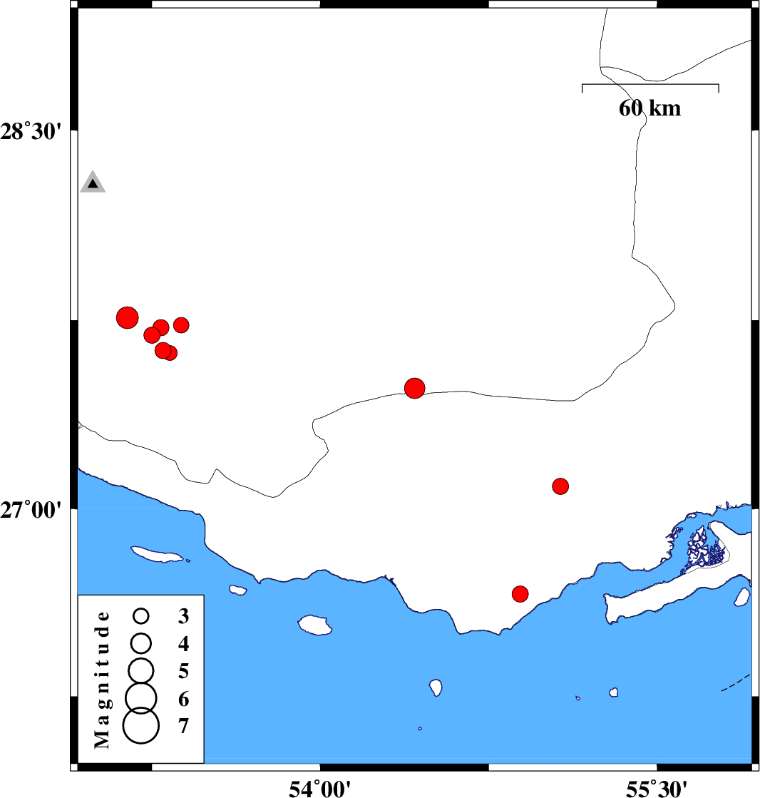 | 2020/09/10 | 05:10:21.0 | 09:40:21.0 | 27.63 | 53.3 | 10 | ML:3.3 | Fars Province, 36 km North-East of Lamerd | ||