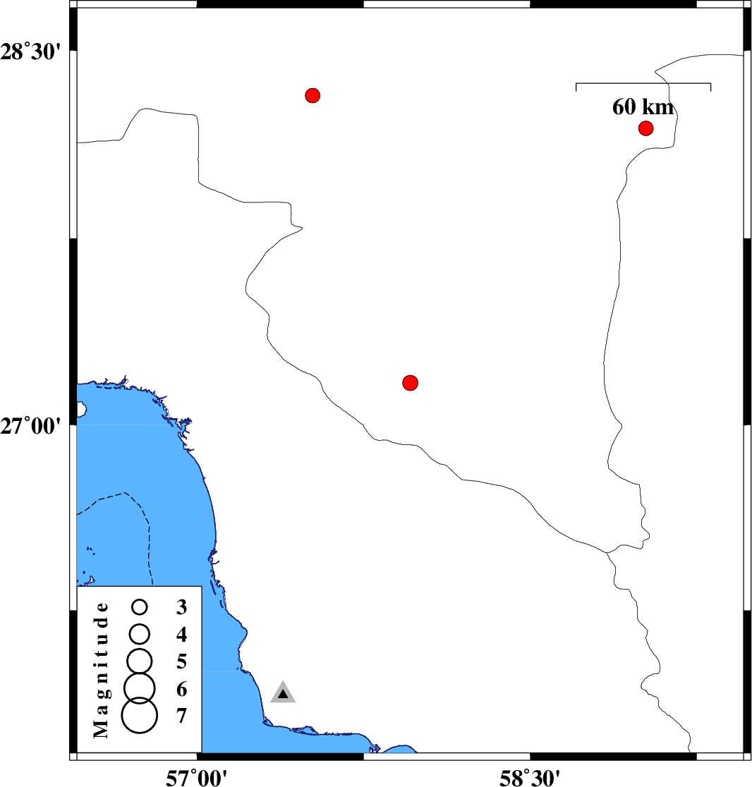 | 2020/09/13 | 02:28:31.7 | 06:58:31.7 | 28.19 | 59.02 | 10 | ML:3 | Kerman Province, 133 km North-East of Kahnuj |