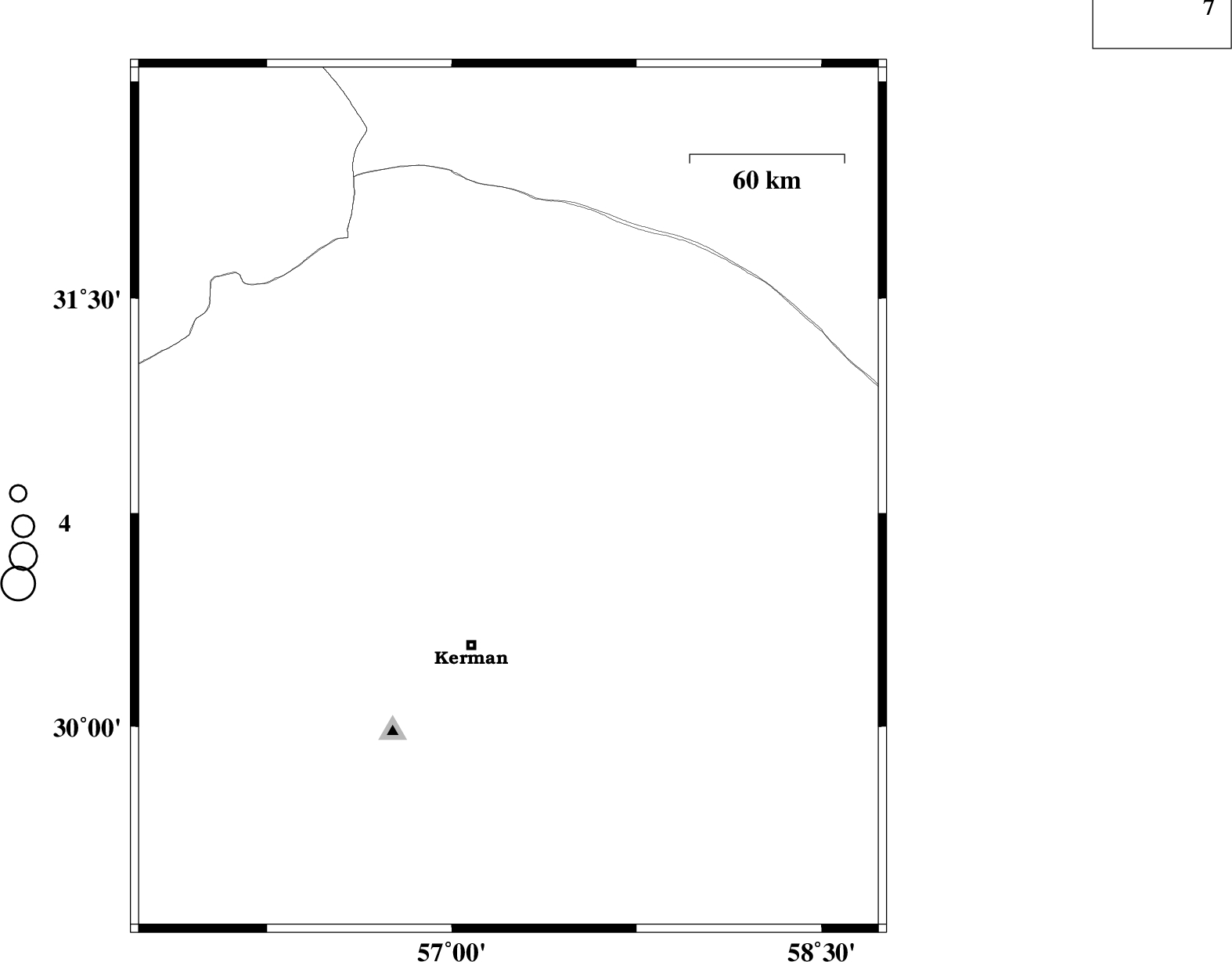 | 2020/09/19 | 09:23:13.5 | 13:53:13.5 | 30.8 | 57.23 | 10 | ML:3.2 | Kerman Province, 59 km North-East of Kerman |