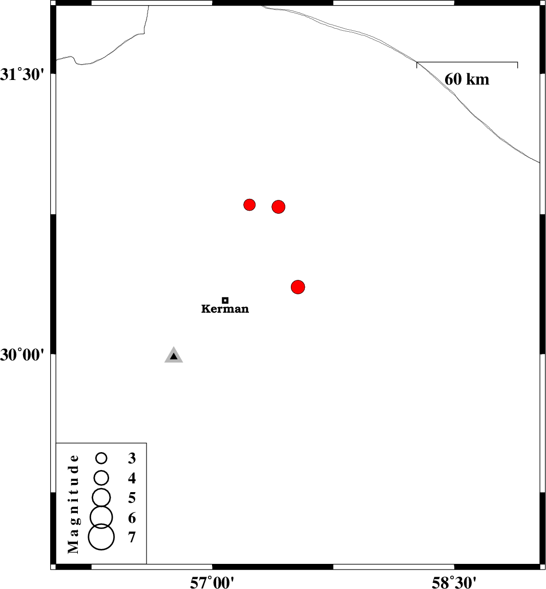 | 2020/09/19 | 21:16:48.1 | 01:46:48.1 | 30.79 | 57.41 | 10 | ML:3.6 | Kerman Province, 64 km North-East of Kerman | ||