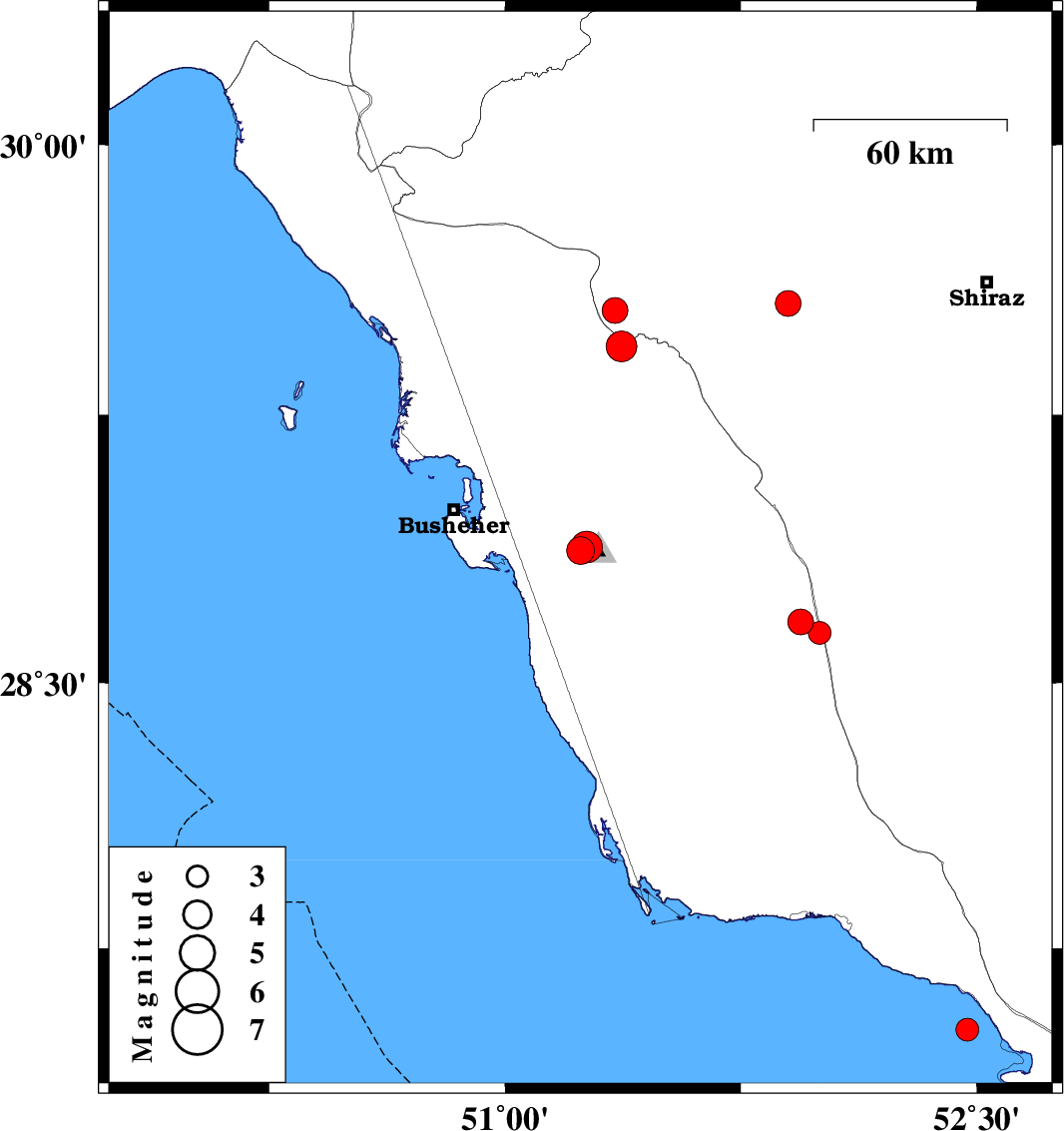 | 2020/09/28 | 08:11:47.7 | 11:41:47.7 | 28.87 | 51.24 | 10 | ML:4 | Bushehr Province, 2 km of Ahram | ||
