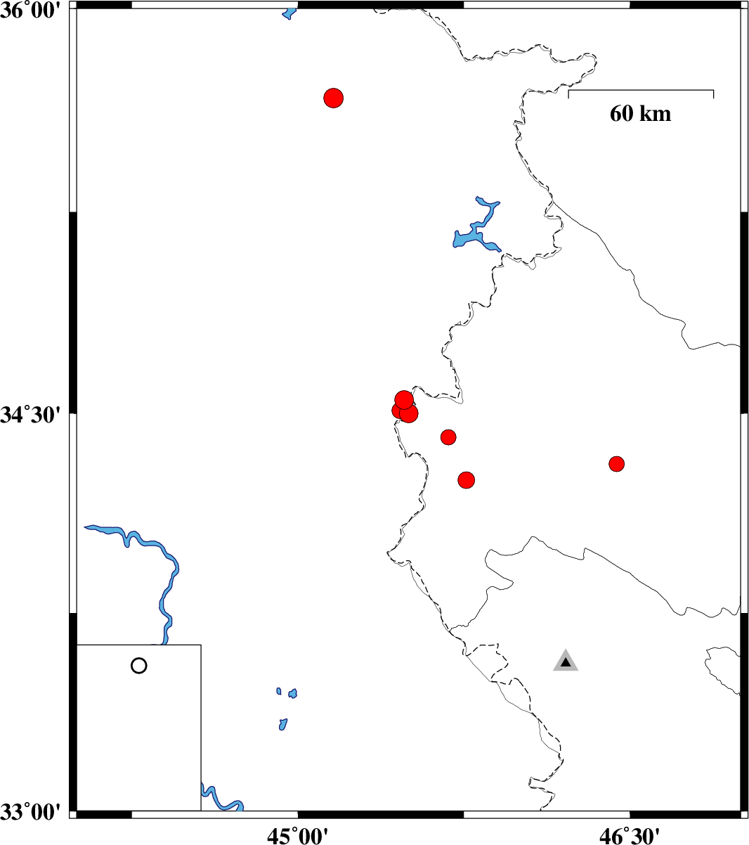 | 2020/09/28 | 18:46:00.2 | 22:16:00.2 | 34.55 | 45.48 | 10 | ML:3.8 | Iraq, 10 km -West of Qasr-E-Shirin | ||