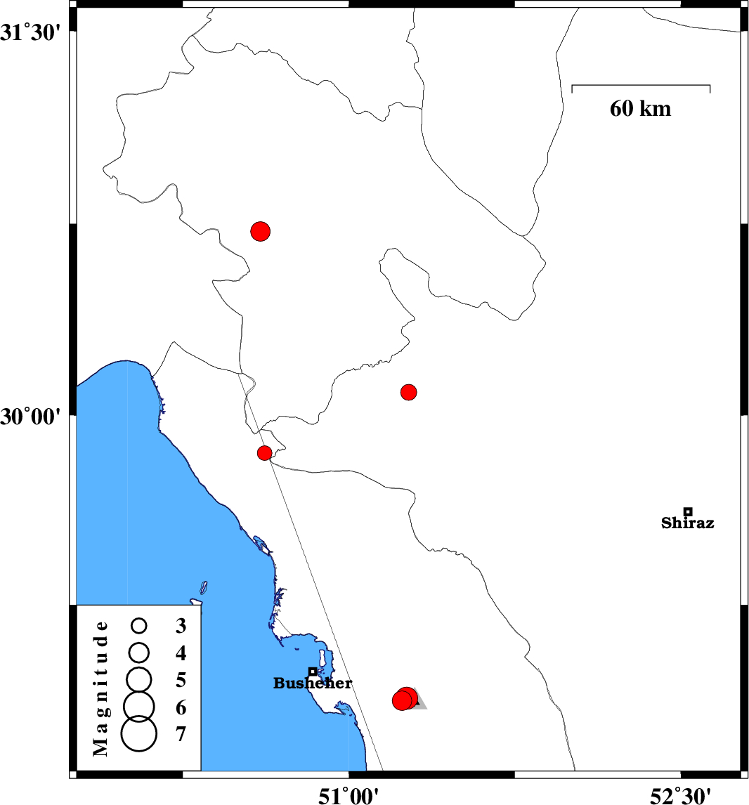 | 2020/09/28 | 08:11:47.7 | 11:41:47.7 | 28.87 | 51.24 | 10 | ML:4 | Bushehr Province, 2 km of Ahram | ||