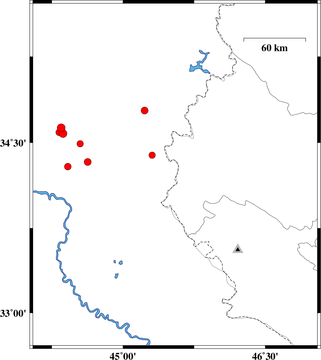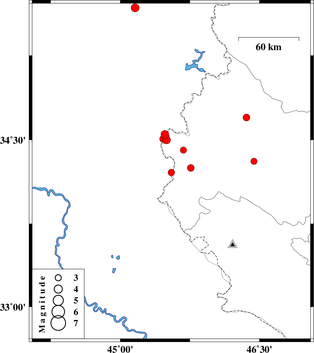 | 2020/09/28 | 18:46:00.2 | 22:16:00.2 | 34.55 | 45.48 | 10 | ML:3.8 | Iraq, 10 km -West of Qasr-E-Shirin | ||