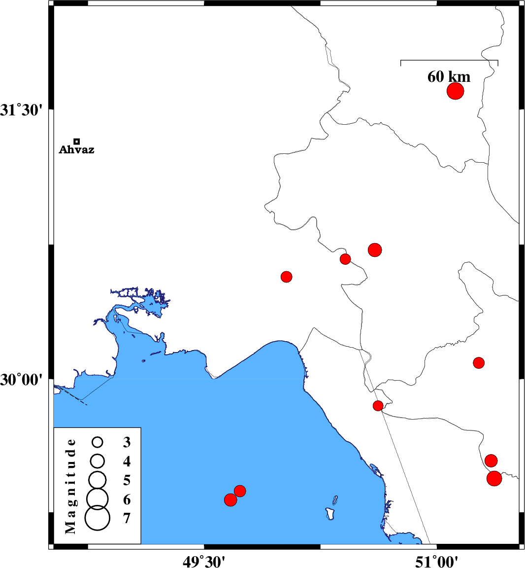 | 2020/09/18 | 04:14:26.6 | 08:44:26.6 | 29.37 | 49.73 | 23 | ML:3.4 | Persian Gulf, 96 km South of Hendijan |
