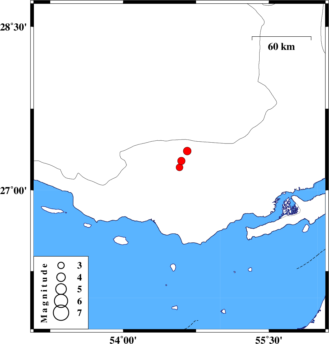 | 2020/10/26 | 17:28:14.1 | 20:58:14.1 | 27.36 | 54.66 | 10 | ML:3.6 | Hormozgan Province, 34 km North-East of Bastak |