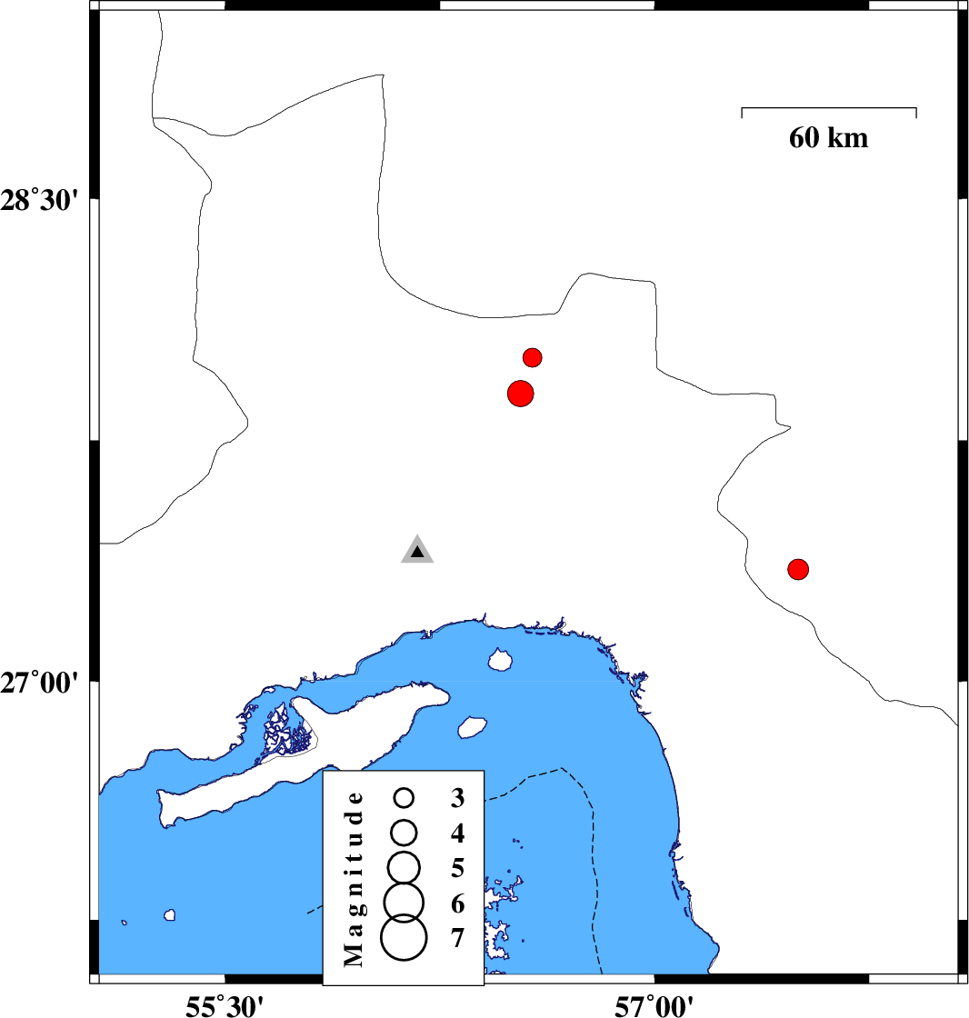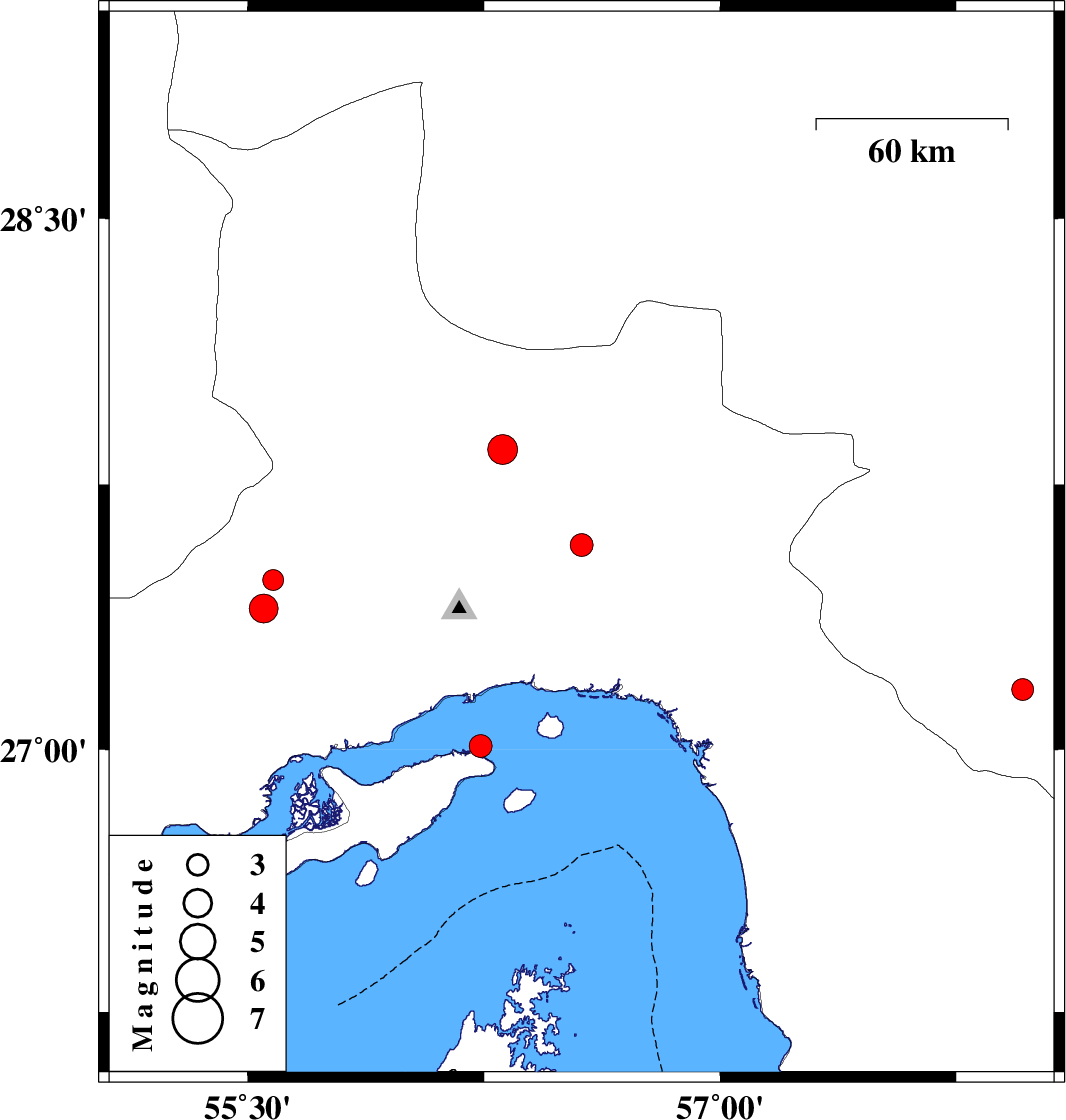 | 2020/09/22 | 19:43:33.8 | 23:13:33.8 | 27.4 | 55.55 | 21 | ML:4.1 | Hormozgan Province, 76 km North-West of Bandar-e abbas | ||