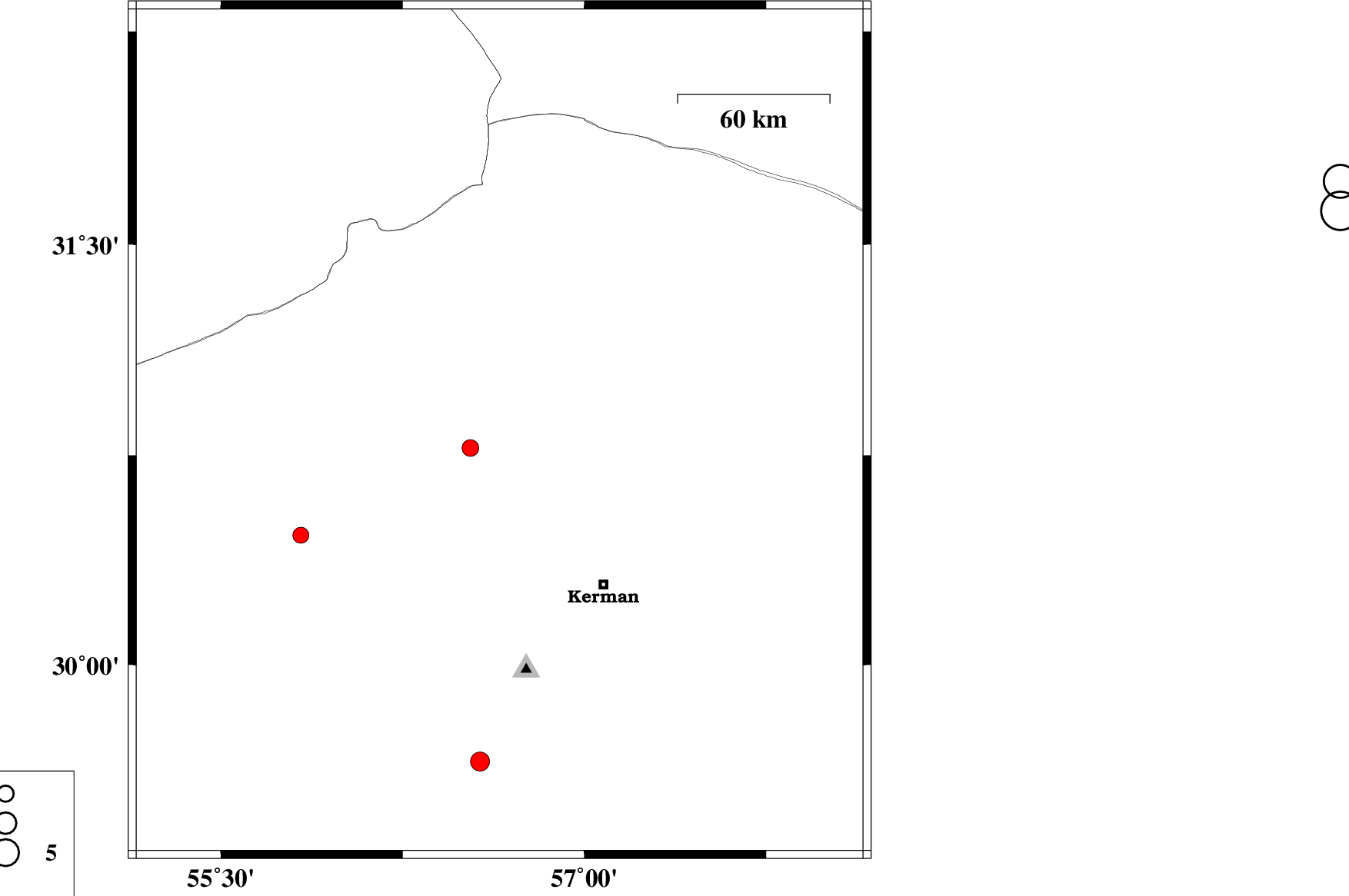| 2020/11/03 | 19:38:23.8 | 23:08:23.8 | 30.02 | 57.39 | 10 | ML:3.5 | Kerman Province, 42 km South-East of Kerman | ||