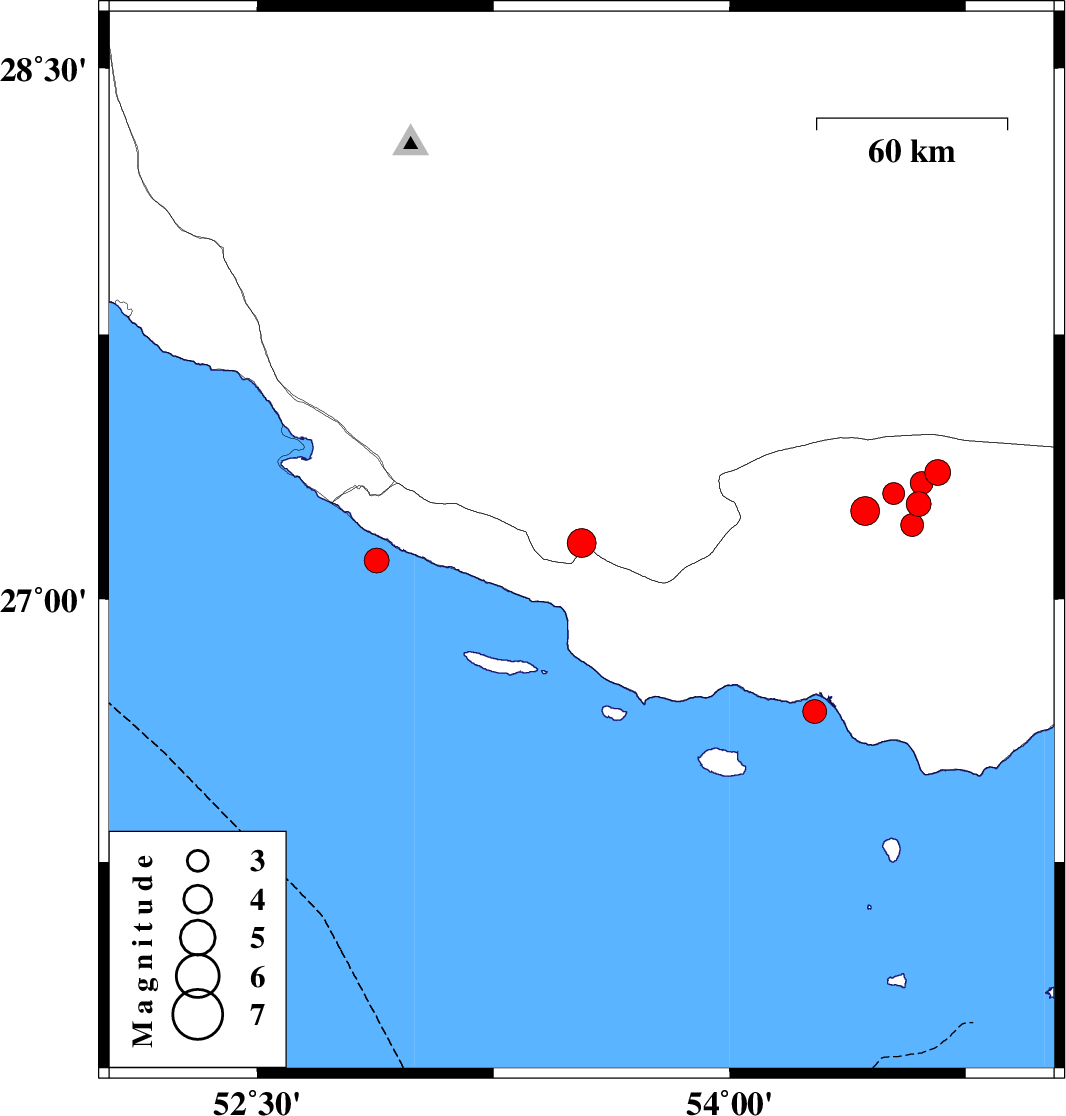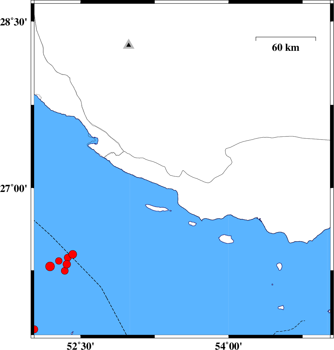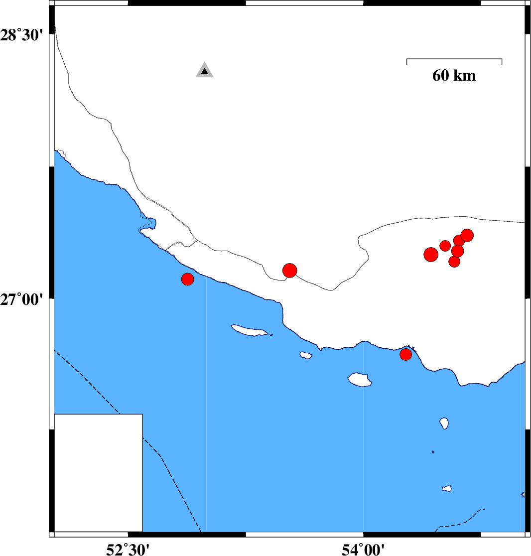 | 2020/10/25 | 09:44:20.3 | 13:14:20.3 | 27.11 | 52.88 | 10 | ML:3.5 | Persian Gulf, 49 km South of Mehr | ||