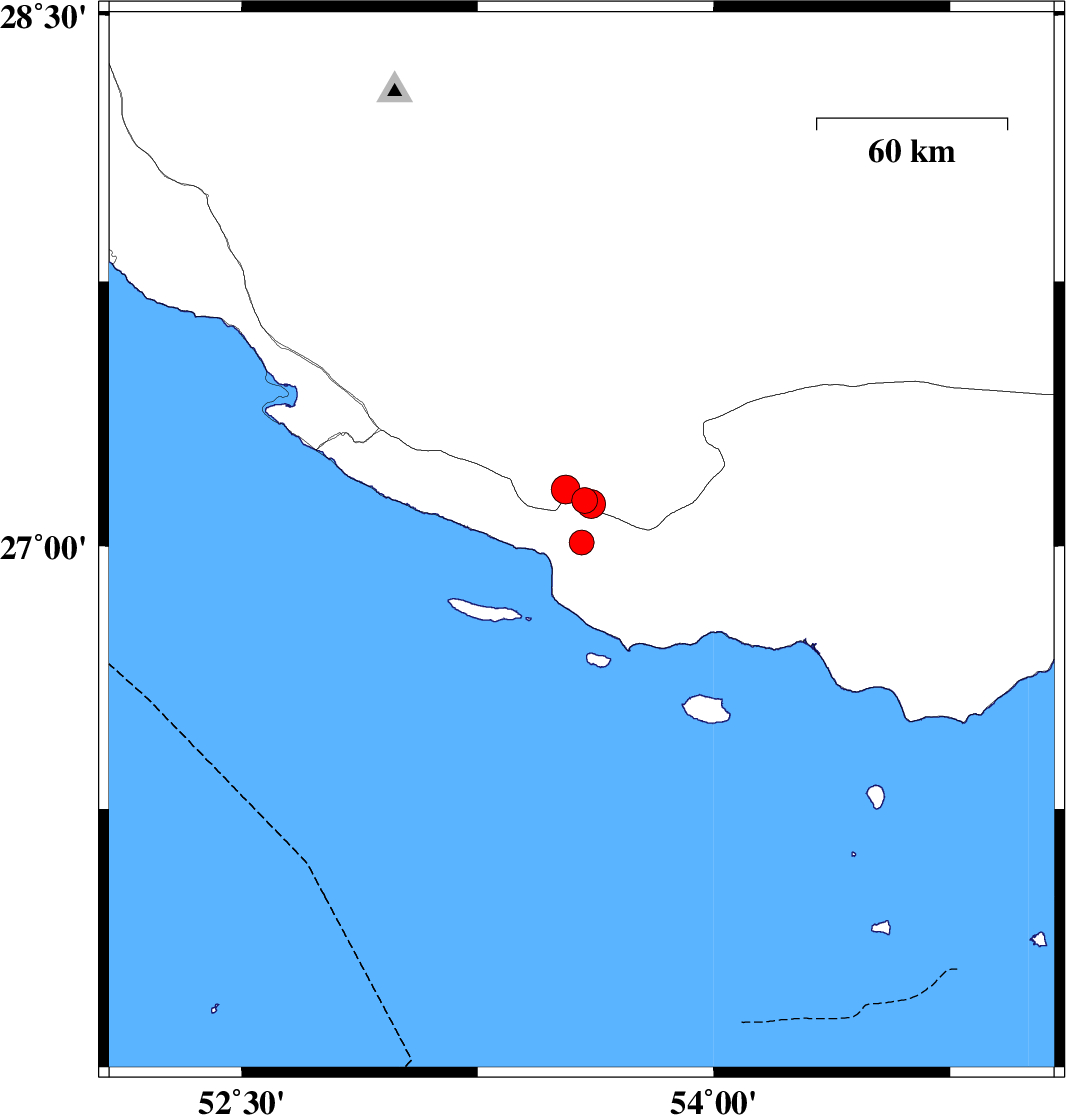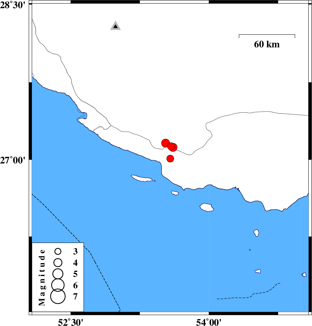 | 2020/11/09 | 11:49:21.4 | 15:19:21.4 | 27.01 | 53.58 | 15 | ML:3.5 | Hormozgan Province, 54 km South-East of Lamerd | ||