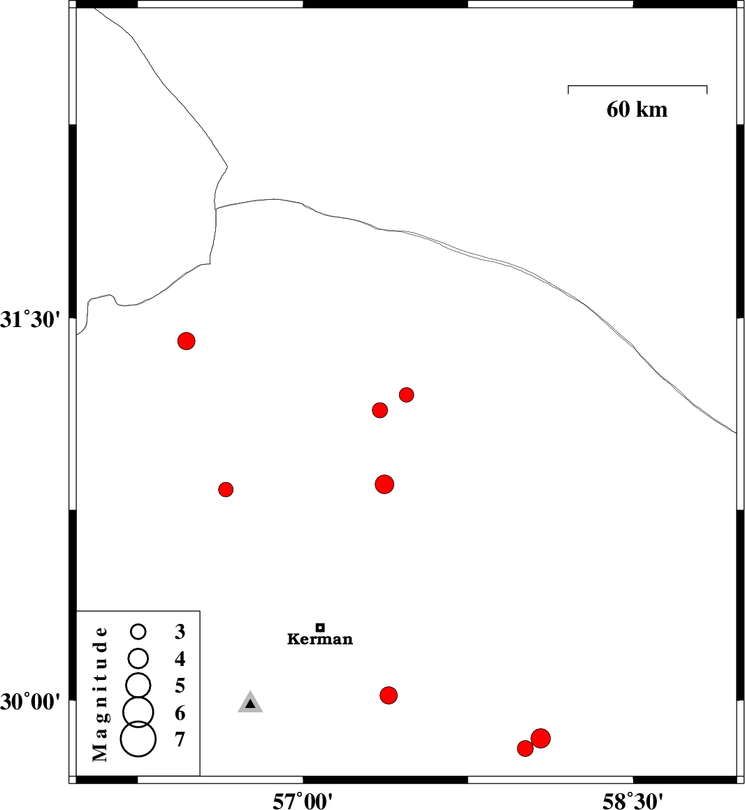 | 2020/11/03 | 19:38:23.8 | 23:08:23.8 | 30.02 | 57.39 | 10 | ML:3.5 | Kerman Province, 42 km South-East of Kerman | ||