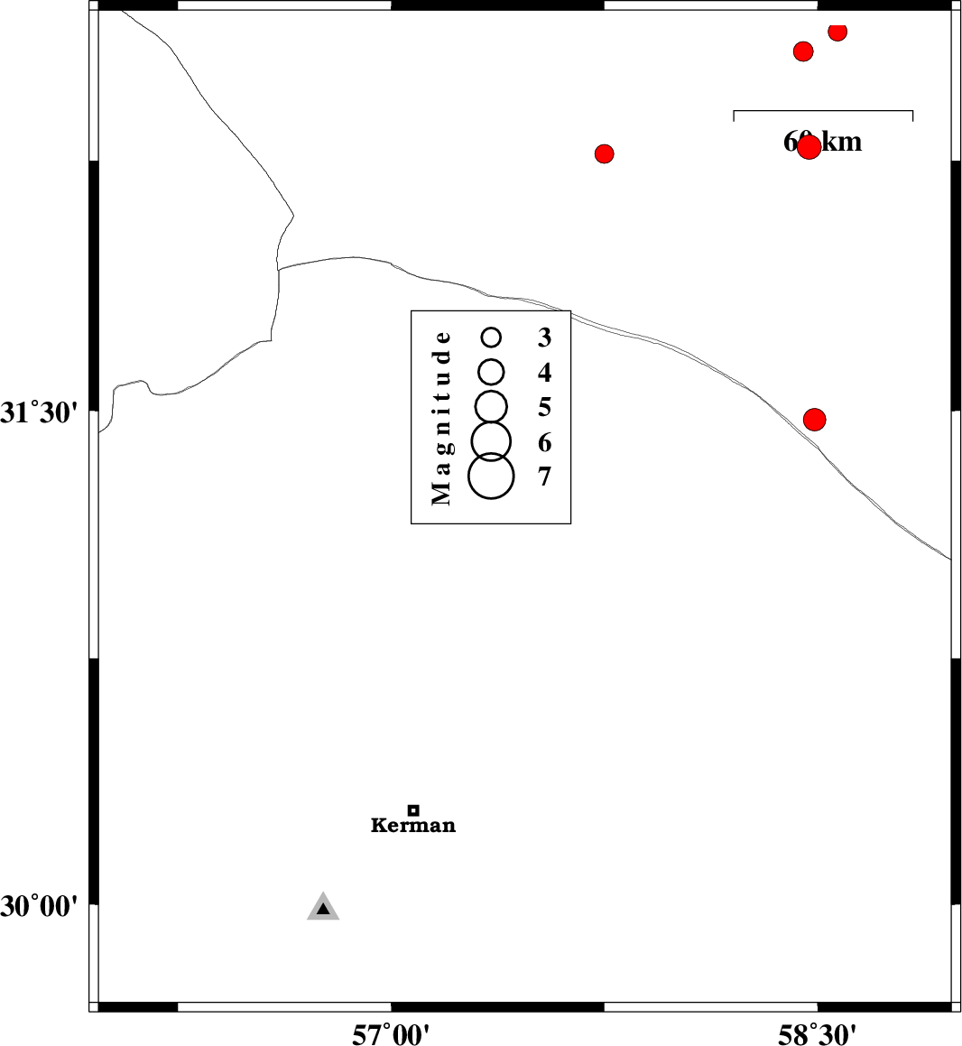 | 2020/11/10 | 21:28:57.9 | 00:58:57.9 | 29.85 | 58.08 | 10 | ML:3.9 | Kerman Province, 87 km North-West of Bam | ||