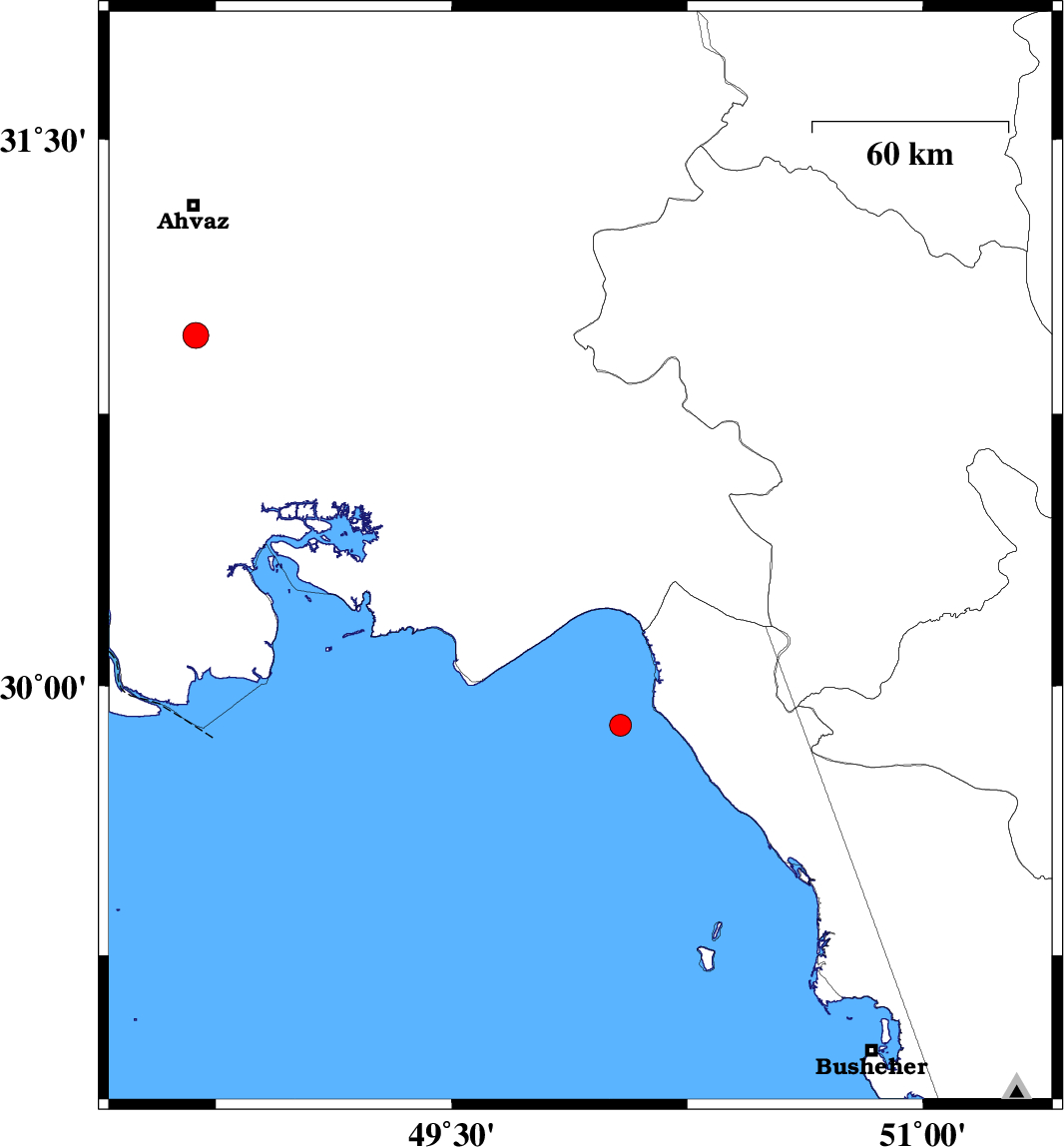 | 2020/11/29 | 04:41:29.2 | 08:11:29.2 | 30.35 | 49.91 | 10 | ML:3.6 | Khoozestan Province, 23 km North-East of Hendijan | ||