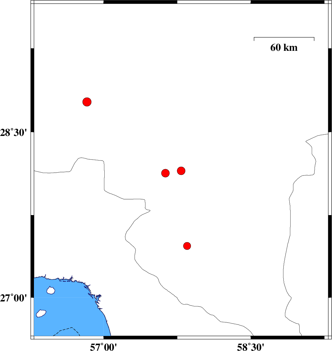 2020/11/05 | 16:56:00.1 | 20:26:00.1 | 28.13 | 57.63 | 20 | ML:3.6 | Kerman Province, 21 km North of Kahnuj | ||