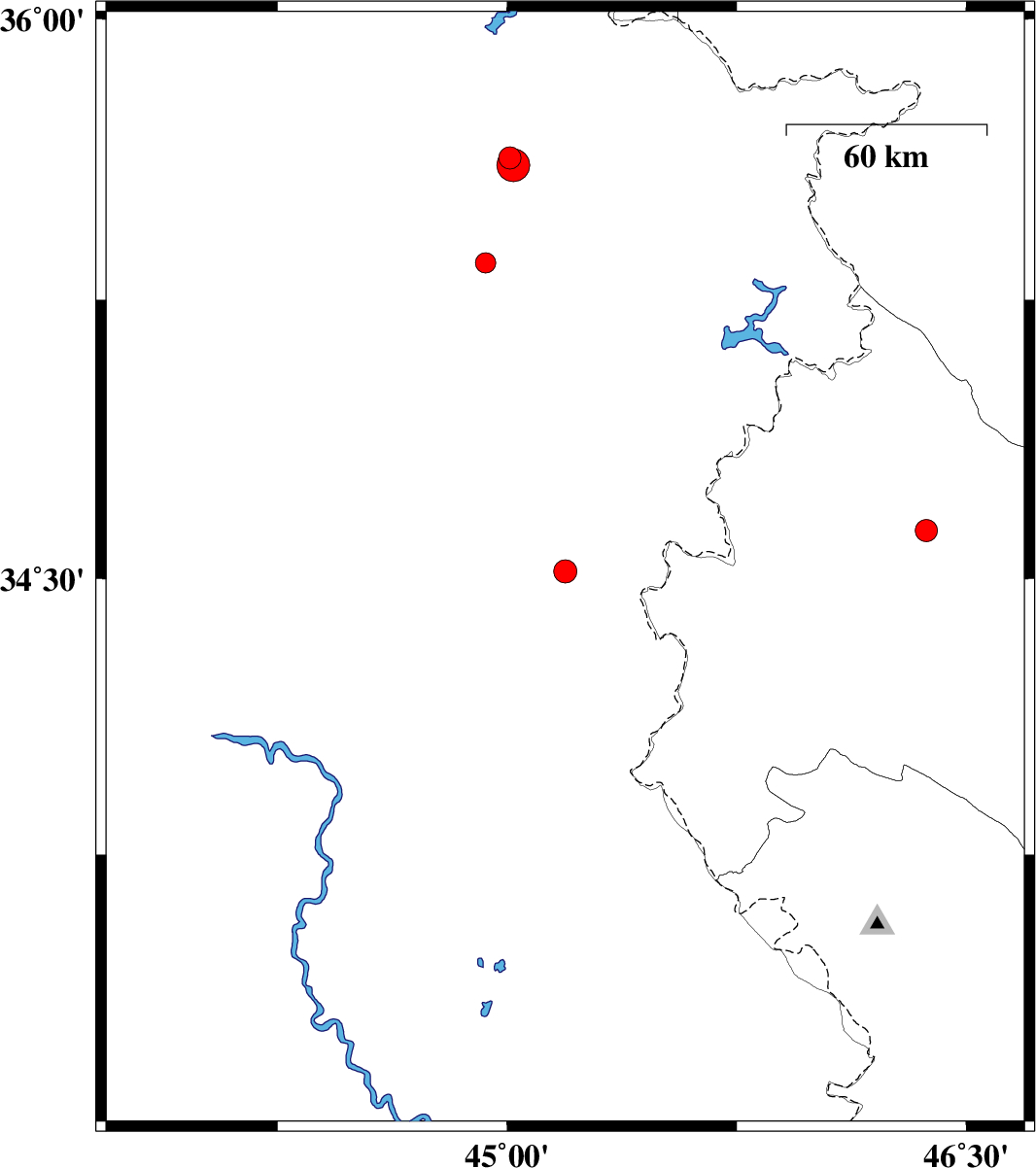 | 2020/11/28 | 08:17:41.2 | 11:47:41.2 | 34.52 | 45.19 | 15 | ML:3.4 | Iraq, 36 km -West of Qasr-E-Shirin | ||