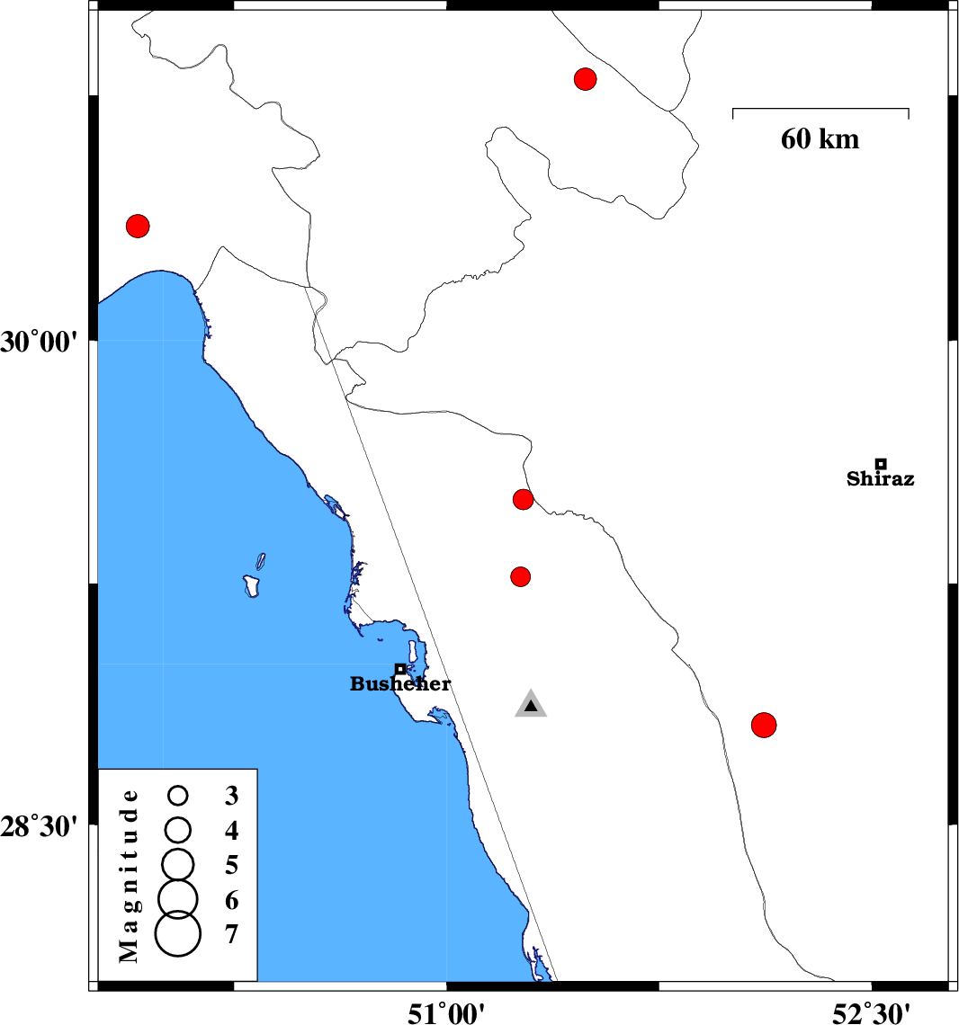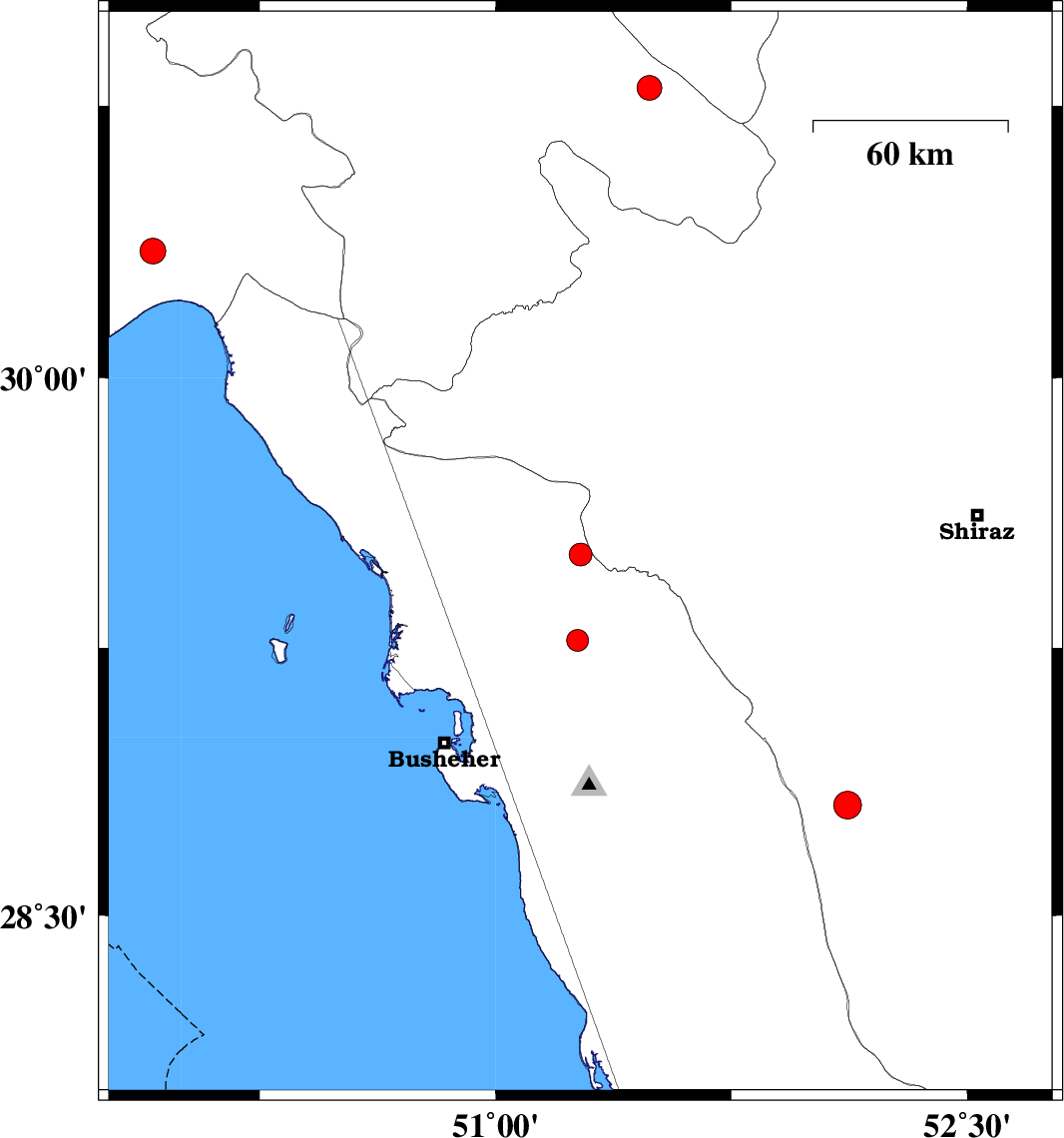 | 2020/11/26 | 12:48:16.2 | 16:18:16.2 | 29.27 | 51.26 | 10 | ML:3.1 | Bushehr Province, 5 km of Borazjan |