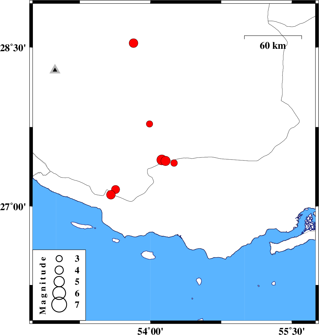 | 2020/11/22 | 01:20:36.5 | 04:50:36.5 | 27.16 | 53.63 | 15 | ML:3.9 | Fars Province, 50 km South-East of Lamerd |
