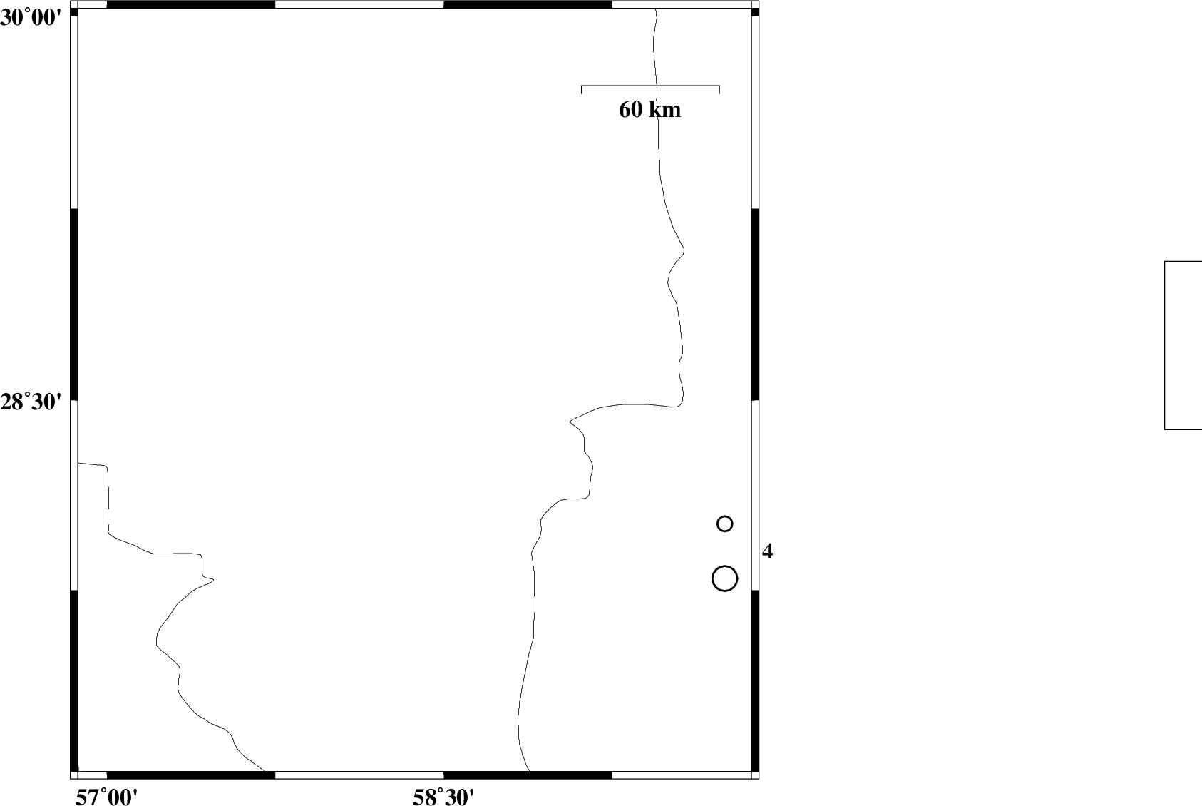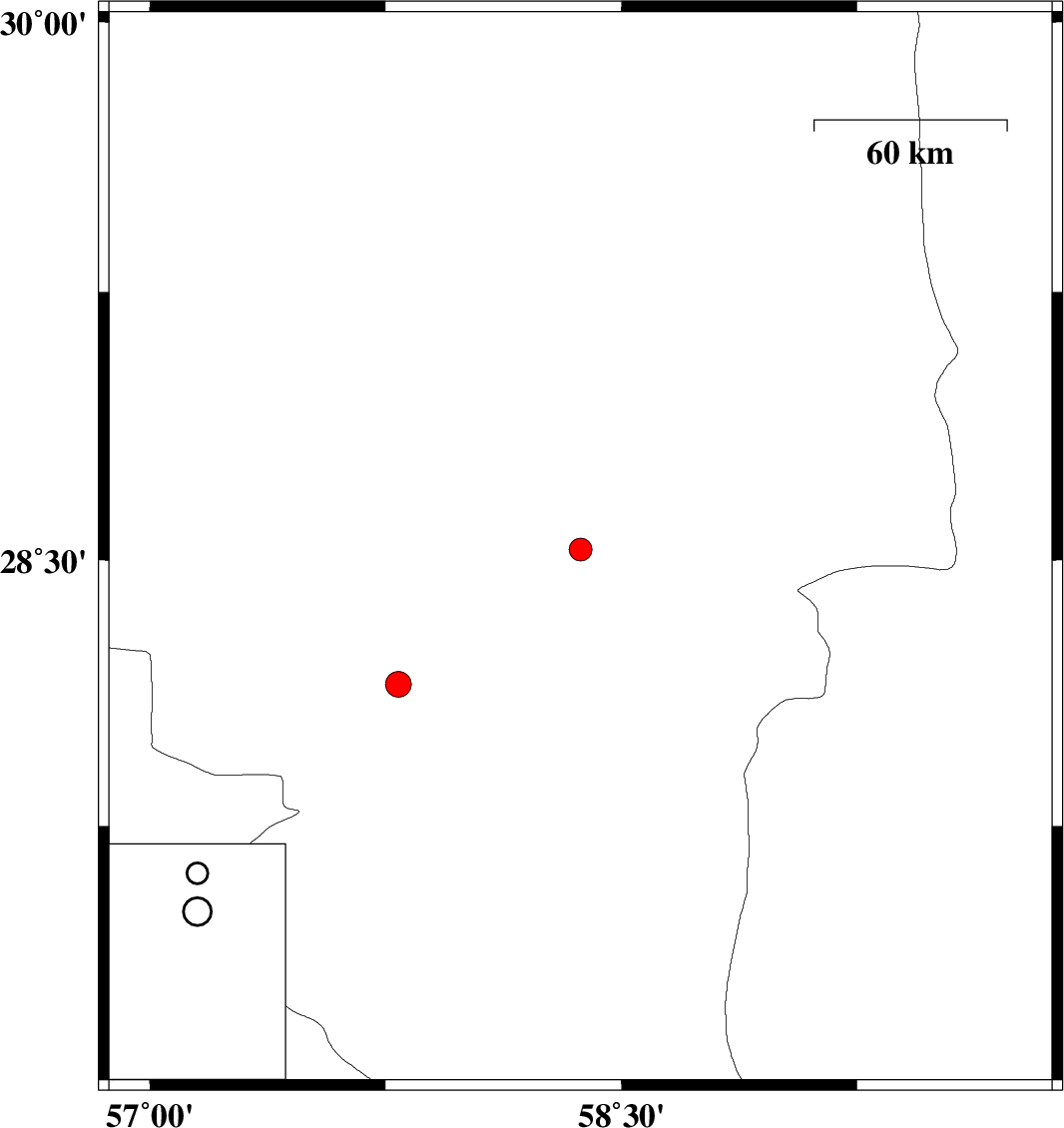 | 2020/12/22 | 21:29:46.2 | 00:59:46.2 | 28.53 | 58.37 | 10 | ML:3.3 | Kerman Province, 64 km South of Bam | ||