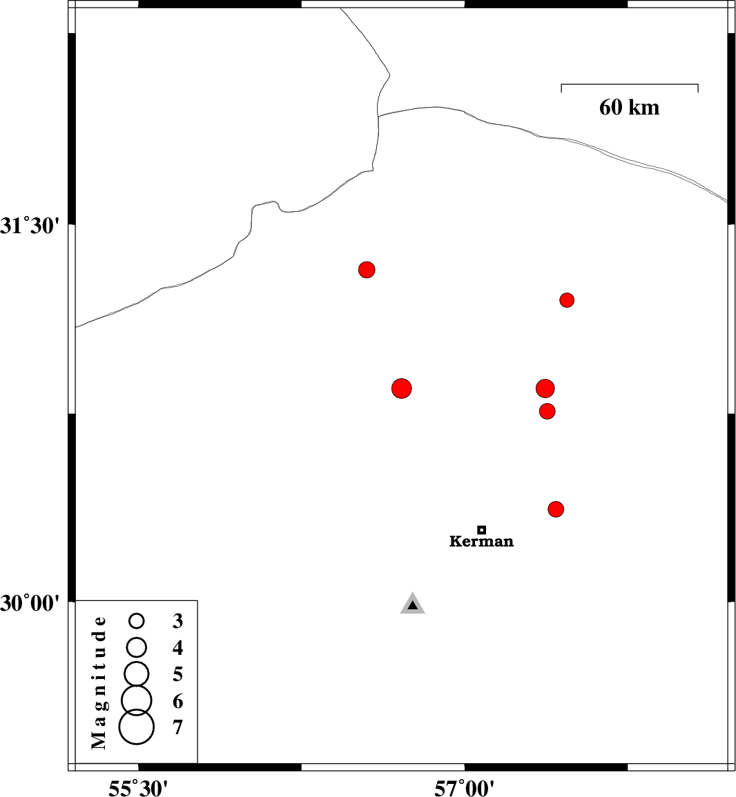 | 2020/11/27 | 04:13:28.7 | 07:43:28.7 | 30.76 | 57.38 | 10 | ML:3.2 | Kerman Province, 60 km North-East of Kerman | ||