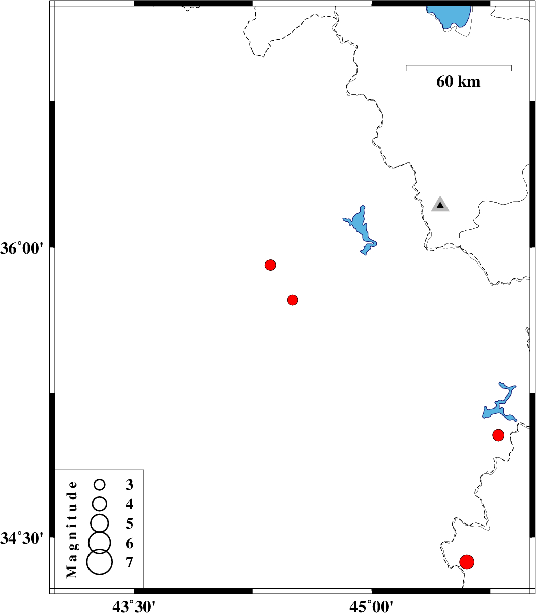 | 2020/12/30 | 04:13:43.2 | 07:43:43.2 | 35.73 | 44.5 | 10 | ML:2.9 | Iraq, 87 km North-West of Sulaymaniyah | ||