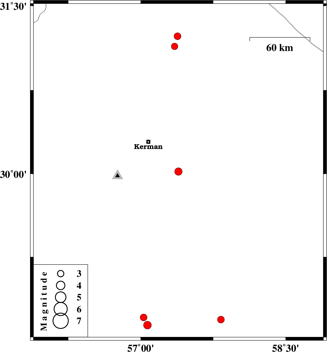 | 2020/11/03 | 19:38:23.8 | 23:08:23.8 | 30.02 | 57.39 | 10 | ML:3.5 | Kerman Province, 42 km South-East of Kerman | ||