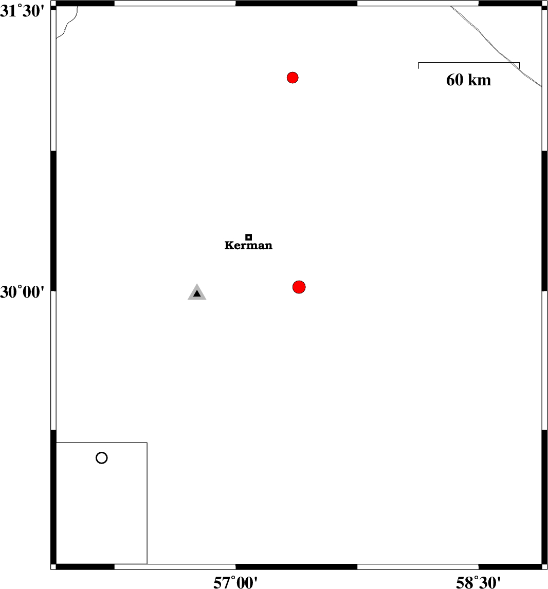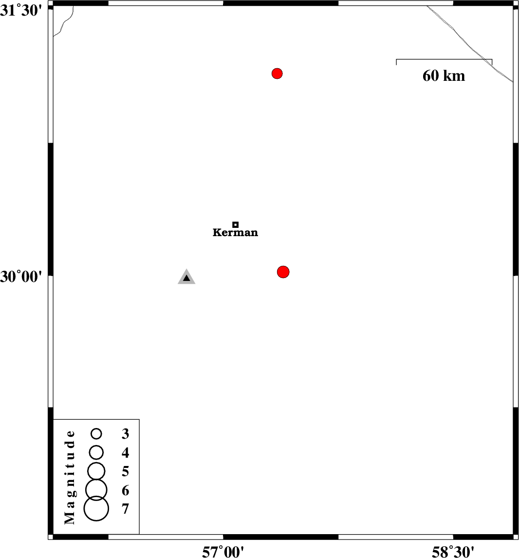 | 2020/11/03 | 19:38:23.8 | 23:08:23.8 | 30.02 | 57.39 | 10 | ML:3.5 | Kerman Province, 42 km South-East of Kerman | ||