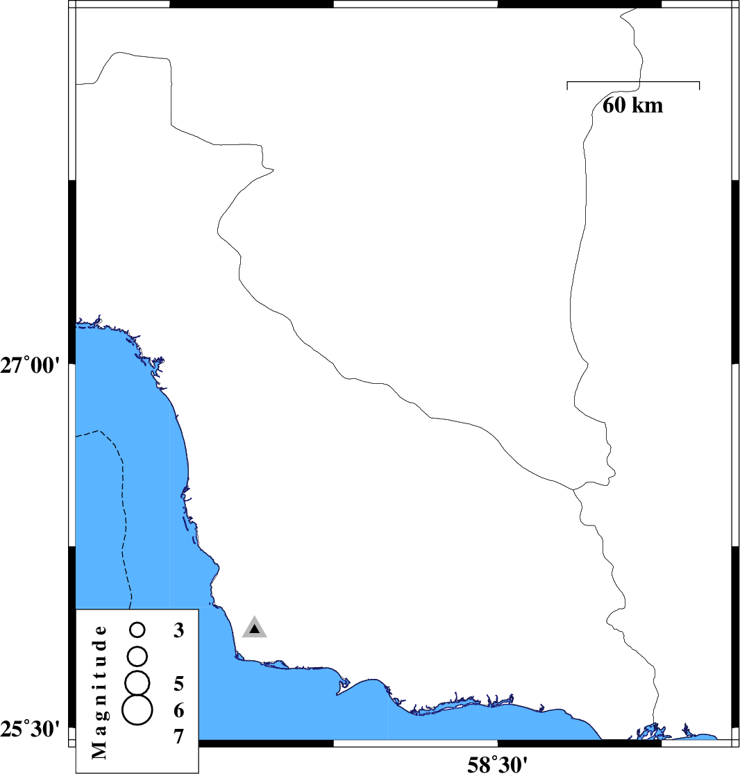 | 2021/01/02 | 20:29:06.9 | 23:59:06.9 | 26.95 | 58.07 | 19 | ML:4 | Kerman Province, 76 km South-East of Manujan | ||