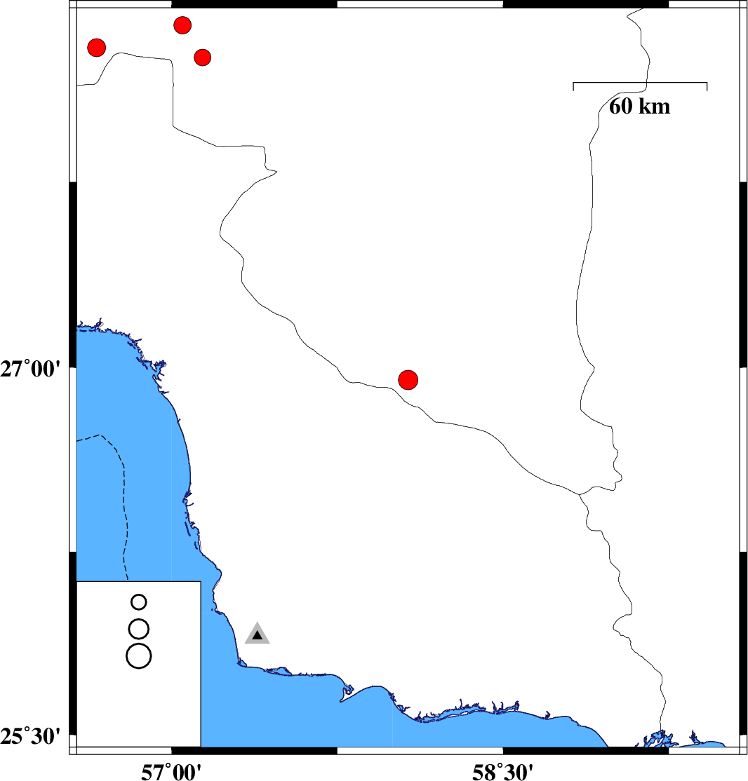 | 2020/12/29 | 22:18:36.2 | 01:48:36.2 | 28.25 | 57.14 | 10 | ML:3.4 | Kerman Province, 64 km North-West of Kahnuj | ||