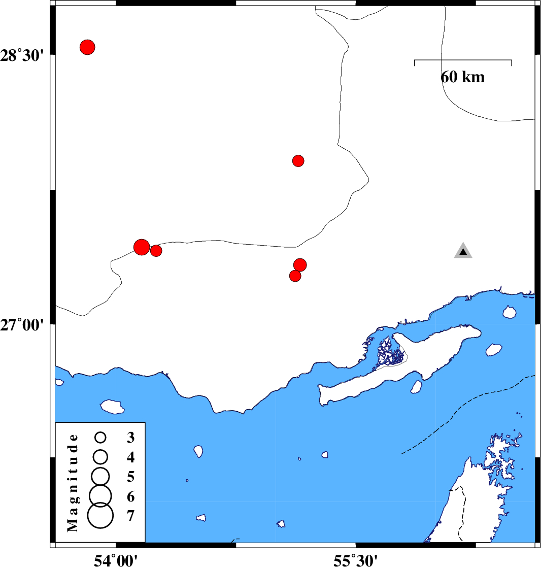 | 2020/12/11 | 20:47:54.7 | 00:17:54.7 | 27.43 | 54.16 | 10 | ML:4.5 | Fars Province, 33 km South-West of Lar | ||
