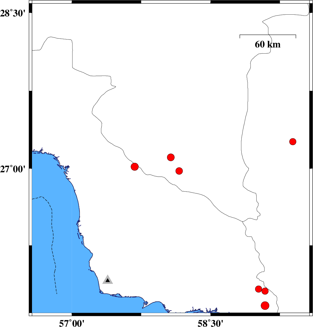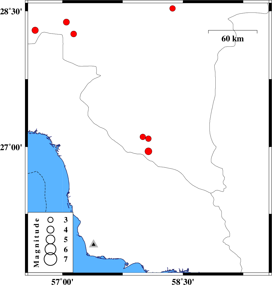 | 2020/12/29 | 22:18:36.2 | 01:48:36.2 | 28.25 | 57.14 | 10 | ML:3.4 | Kerman Province, 64 km North-West of Kahnuj | ||