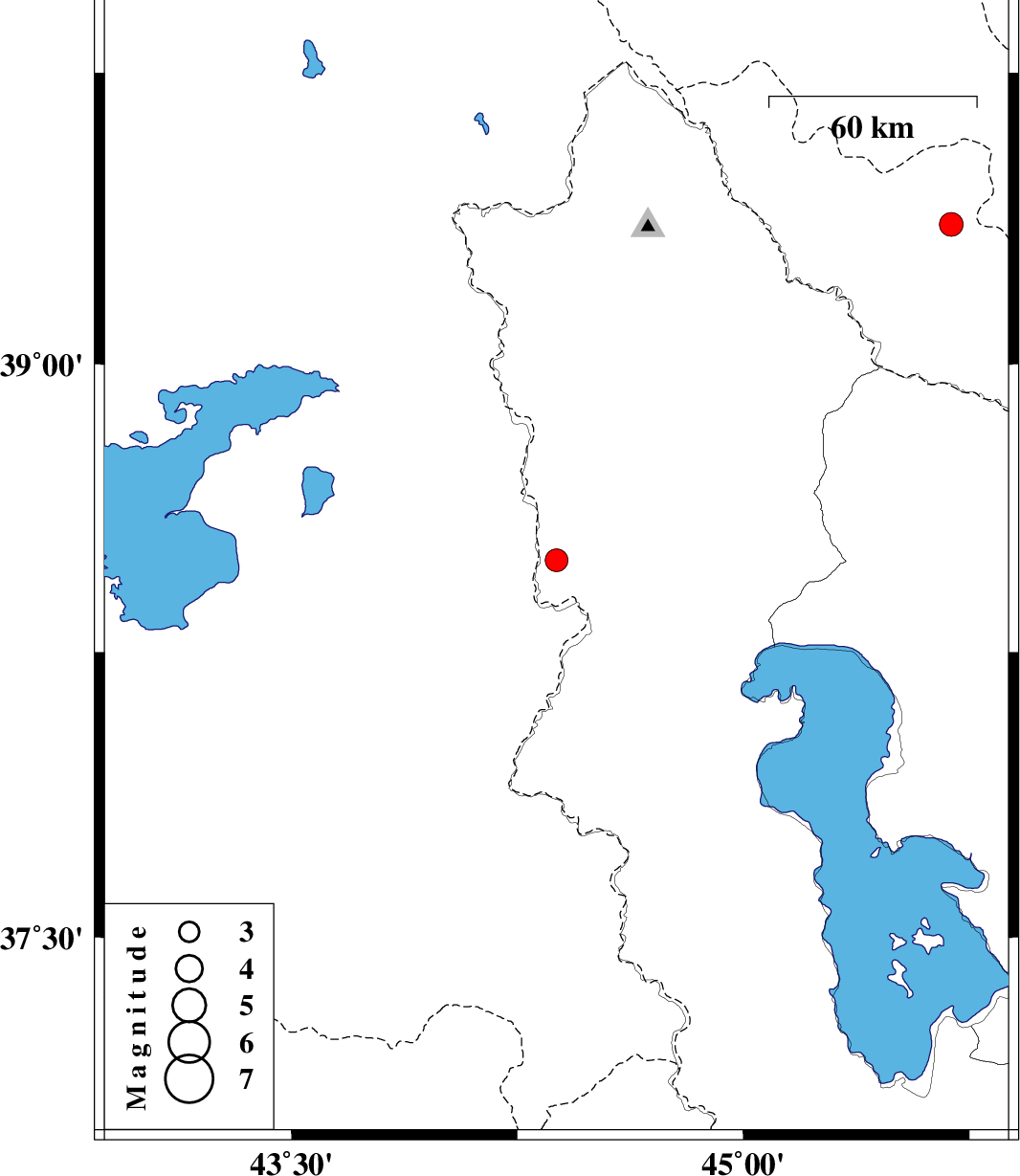 | 2021/01/22 | 06:22:59.9 | 09:52:59.9 | 38.49 | 44.38 | 10 | ML:3.4 | Azarbaijan Gharbi Province, 64 km South of Seyah Cheshmah | ||