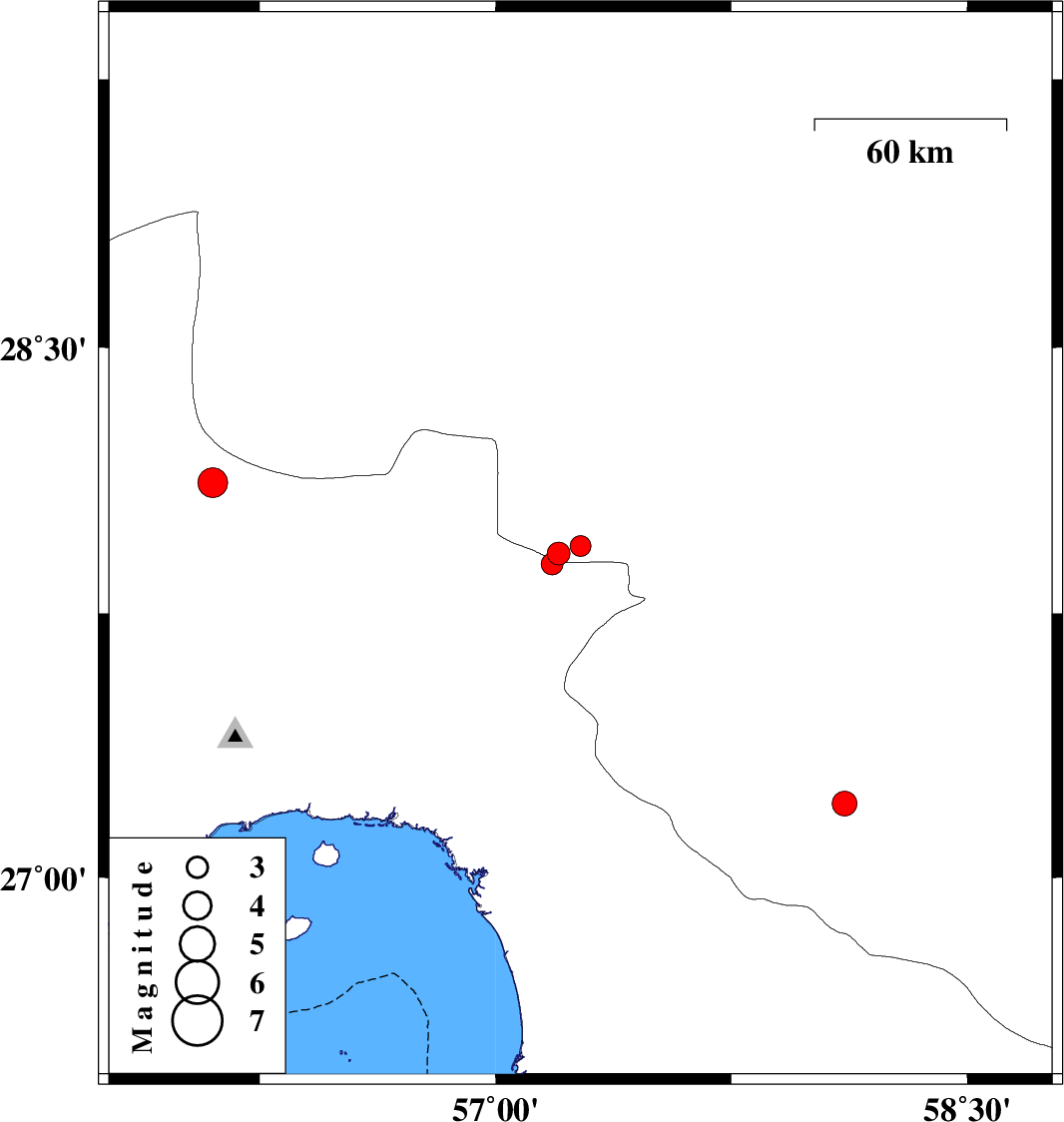 | 2021/01/25 | 21:51:44.6 | 01:21:44.6 | 27.92 | 57.2 | 10 | ML:3.2 | Kerman Province, 49 km -West of Kahnuj | ||