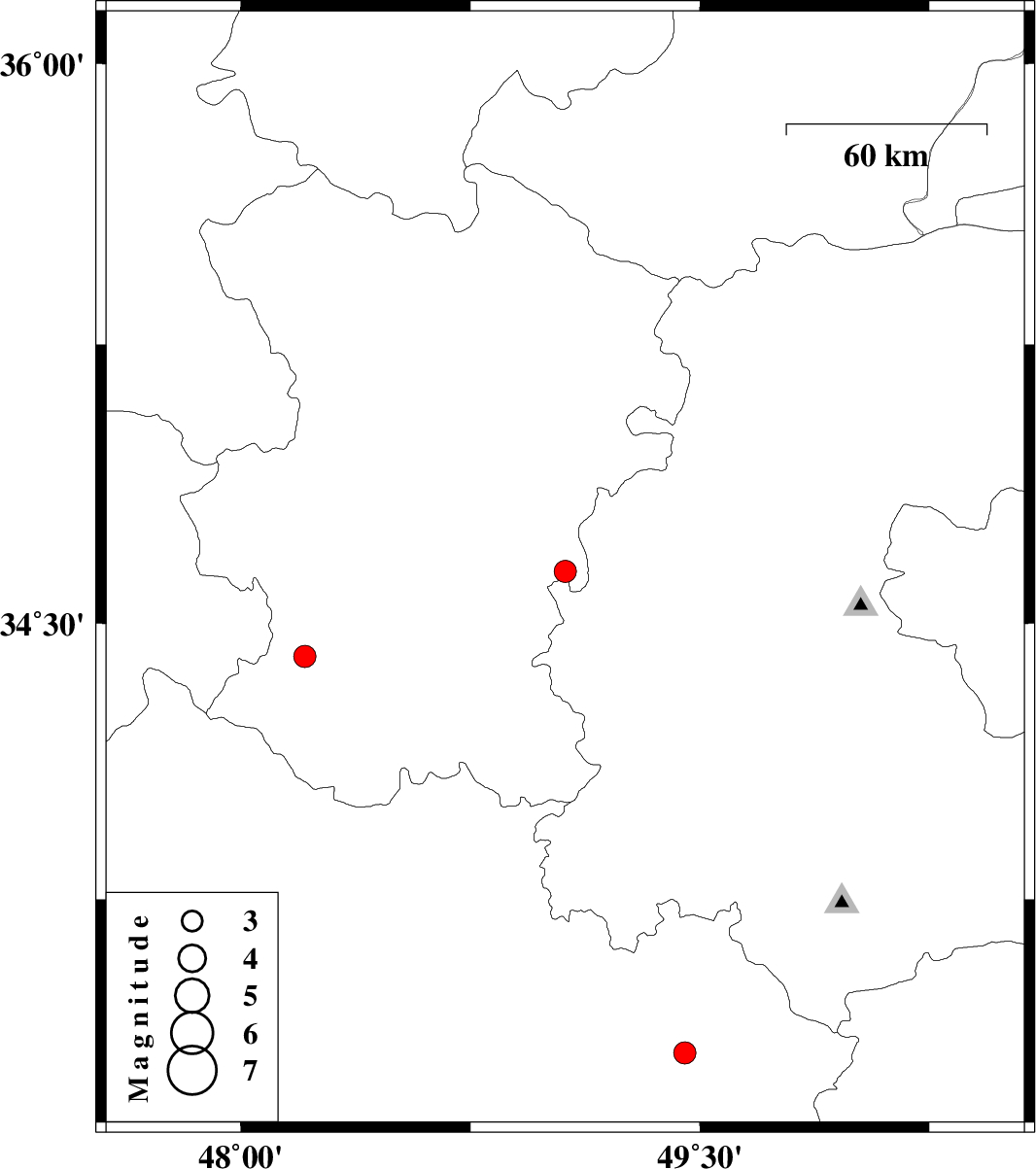 | 2021/01/05 | 02:58:21.1 | 06:28:21.1 | 34.41 | 48.21 | 10 | ML:3.3 | Hamedan Province, 26 km -East of Kangavar |