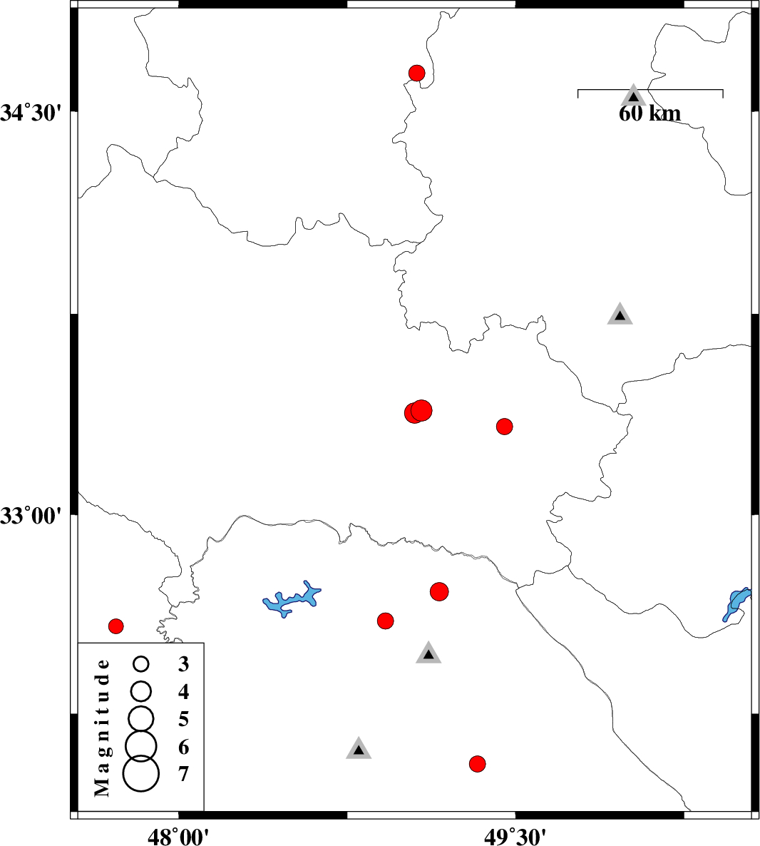 | 2021/01/28 | 07:24:42.3 | 10:54:42.3 | 33.38 | 49.05 | 10 | ML:4.1 | Lorestan Province, 12 km South of Dorud | ||