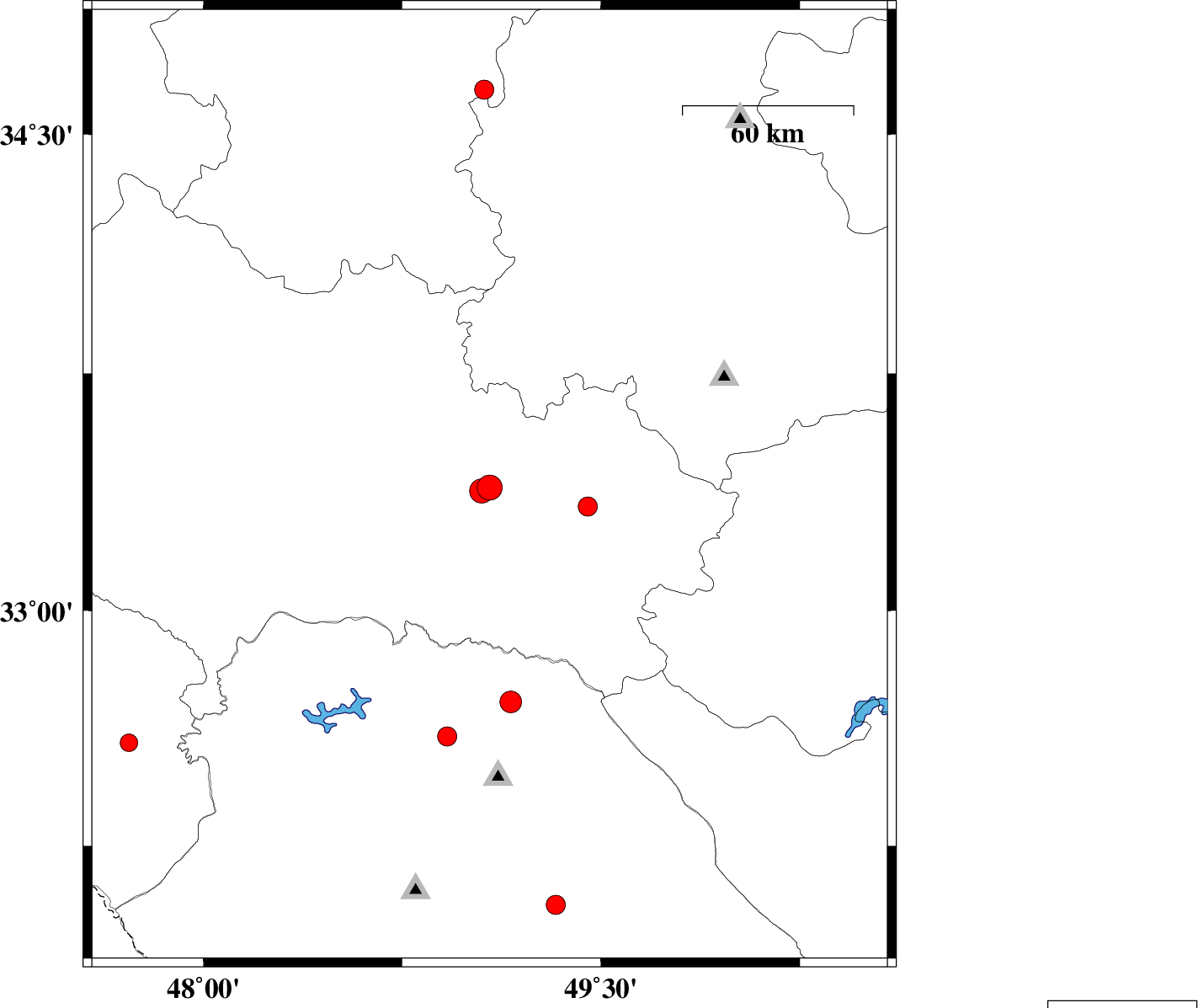 | 2021/01/28 | 07:24:42.3 | 10:54:42.3 | 33.38 | 49.05 | 10 | ML:4.1 | Lorestan Province, 12 km South of Dorud | ||