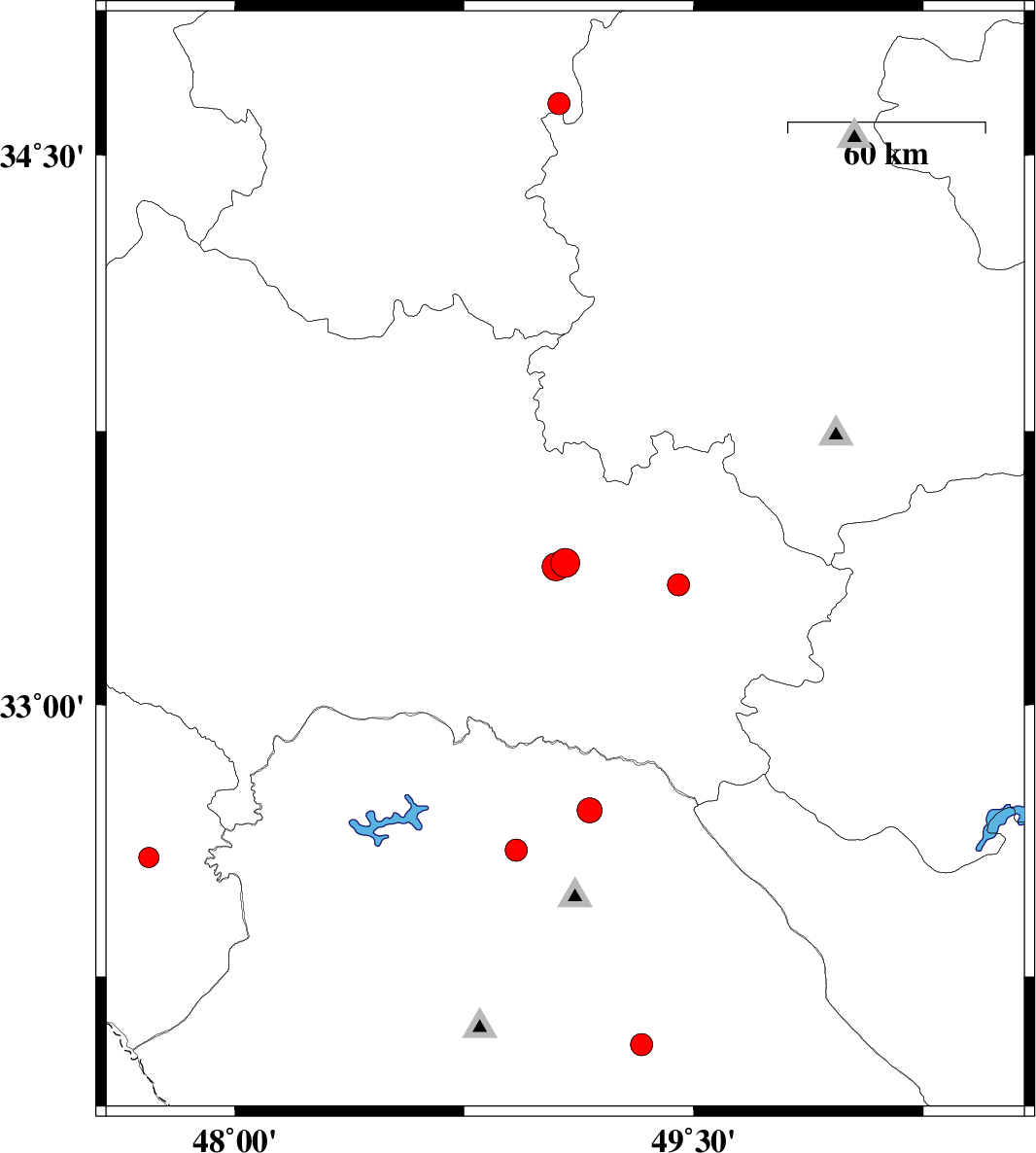 | 2021/01/28 | 07:44:35.3 | 11:14:35.3 | 33.39 | 49.08 | 10 | ML:4.3 | Lorestan Province, 10 km of Dorud | ||
