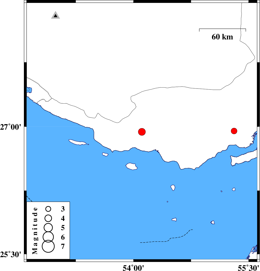 | 2021/01/30 | 09:31:09.9 | 13:01:09.9 | 26.95 | 55.31 | 21 | ML:3.5 | Hormozgan Province, 66 km North-East of Bandar-e lengeh |