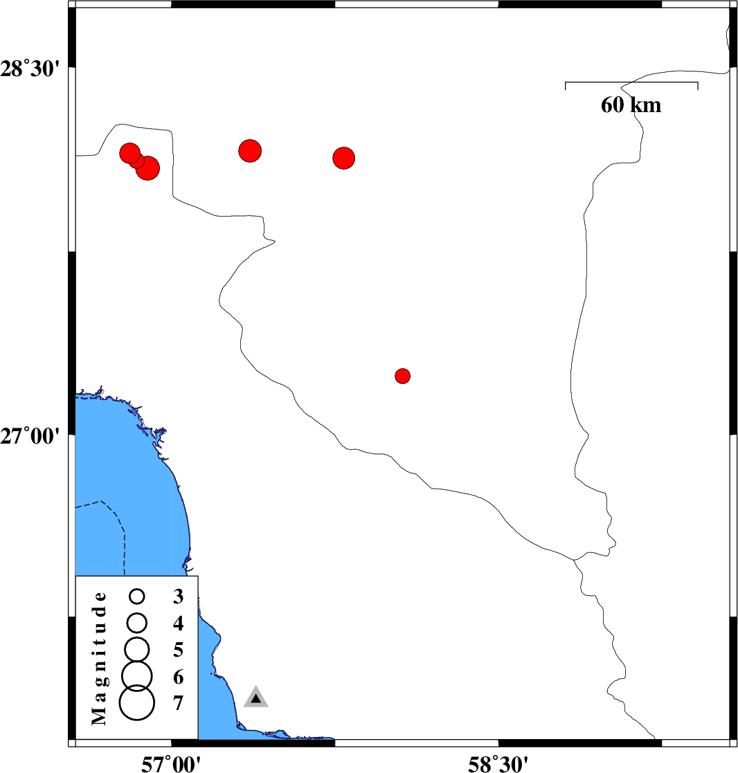 | 2021/01/28 | 18:40:15.1 | 22:10:15.1 | 28.13 | 57.79 | 14 | Mb:4.5 | Kerman Province, 22 km North of Kahnuj |