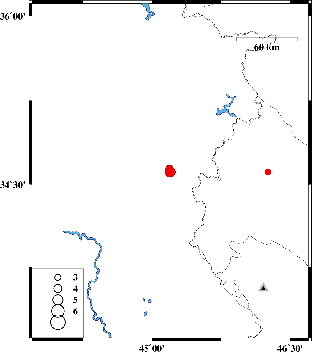 | 2021/02/06 | 23:37:01.4 | 03:07:01.4 | 34.61 | 46.26 | 10 | ML:3.1 | Kermanshah Province, 30 km South-West of Javanrud |