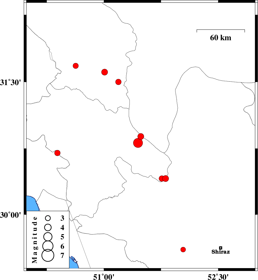 | 2021/01/24 | 18:23:43.2 | 21:53:43.2 | 29.6 | 52.04 | 16 | ML:3 | Fars Province, 37 km -East of Kazerun |