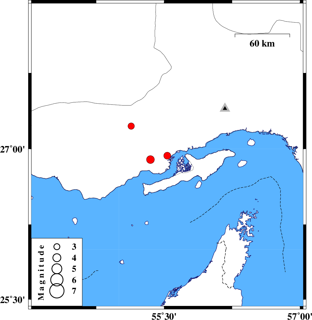 | 2021/02/18 | 07:06:18.0 | 10:36:18.0 | 26.895 | 55.348 | 25 | ML:4 | Hormozgan Province, 64 km North-East of Bandar-e lengeh |