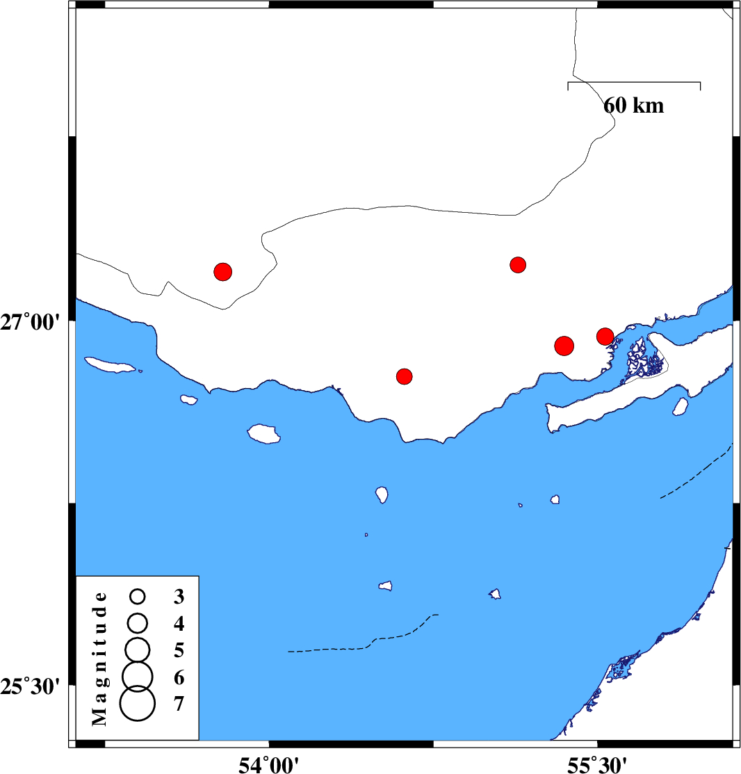 | 2021/02/18 | 07:06:18.0 | 10:36:18.0 | 26.895 | 55.348 | 25 | ML:4 | Hormozgan Province, 64 km North-East of Bandar-e lengeh | ||