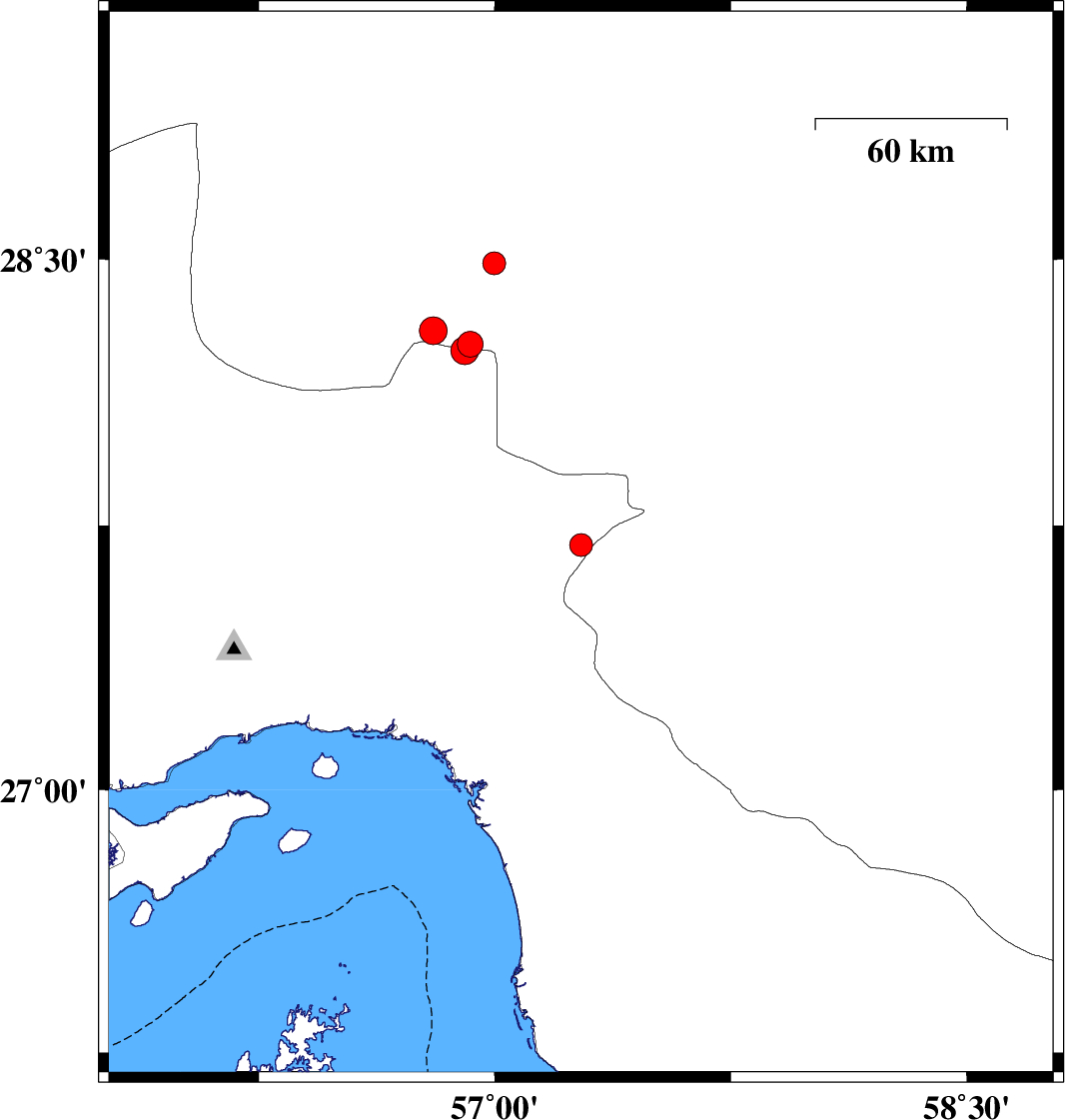 | 2021/03/04 | 03:47:57.2 | 07:17:57.2 | 27.695 | 57.274 | 10 | ML:3.3 | Hormozgan Province, 30 km North of Dehbarez | ||