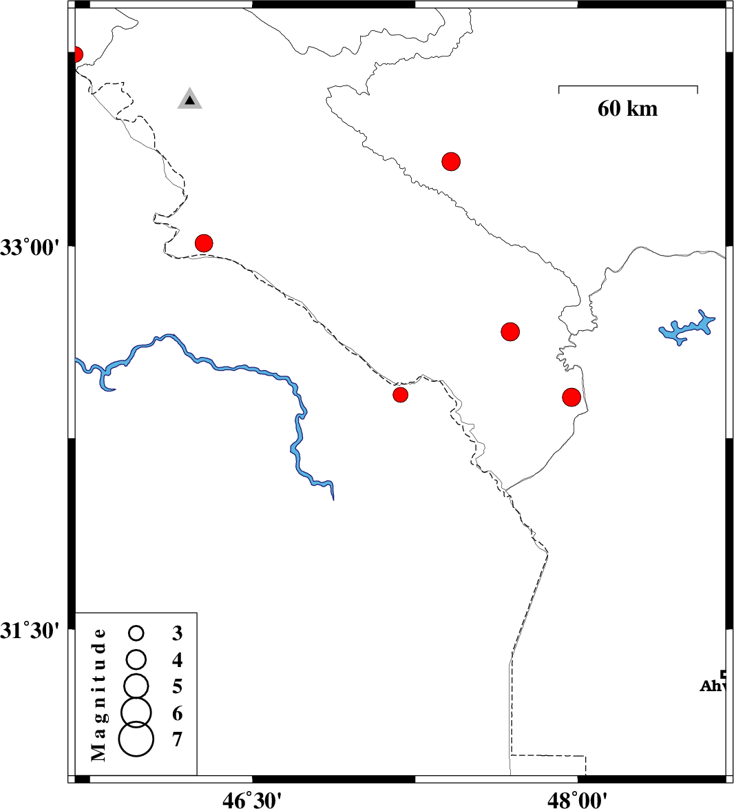 | 2021/03/08 | 03:24:19.0 | 06:54:19.0 | 32.42 | 47.182 | 19 | ML:3.1 | Iraq, 31 km South of Dehloran | ||