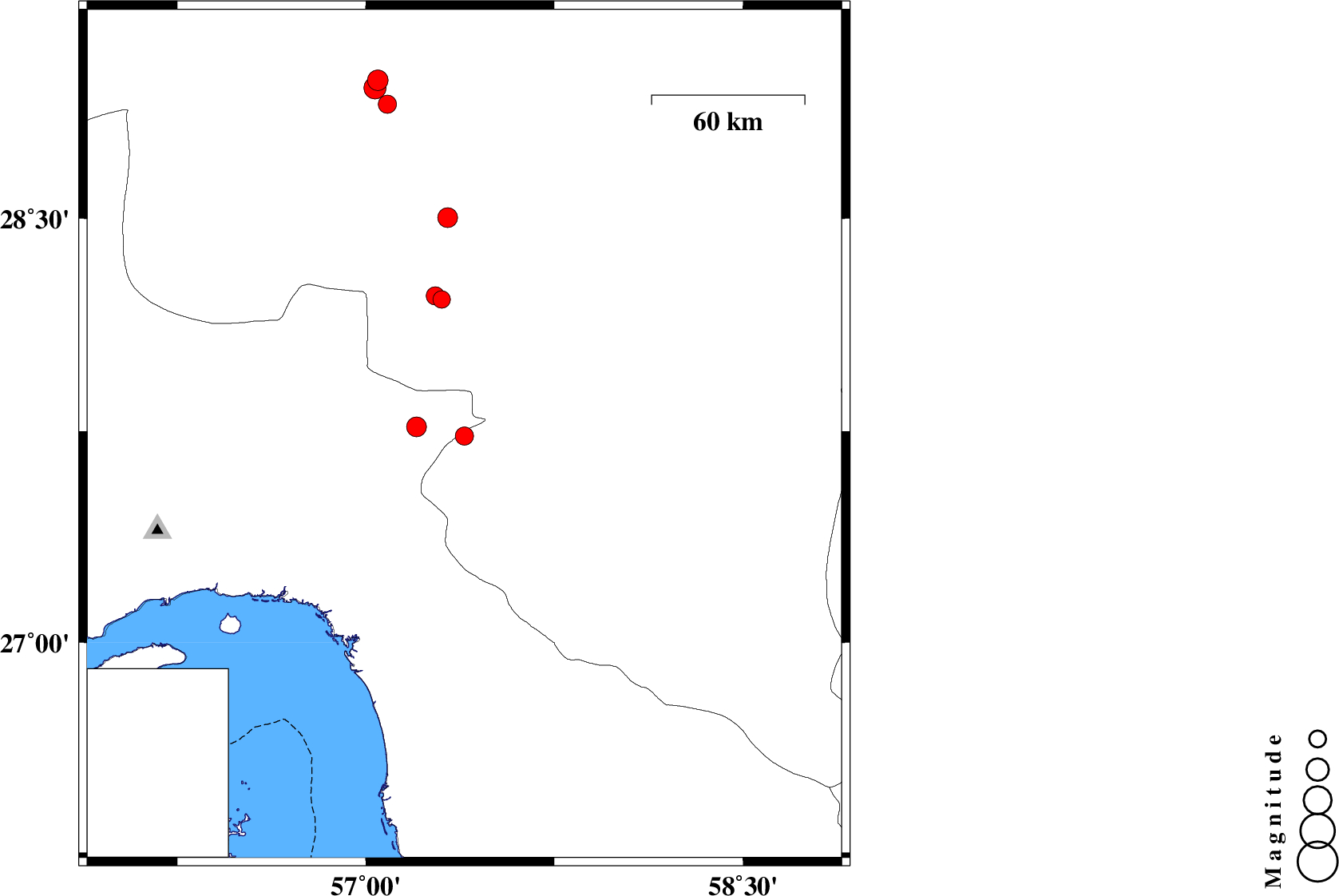 | 2021/04/28 | 05:02:05.0 | 09:32:05.0 | 27.733 | 57.392 | 12 | ML:3.2 | Kerman Province, 37 km North-West of Manujan | ||