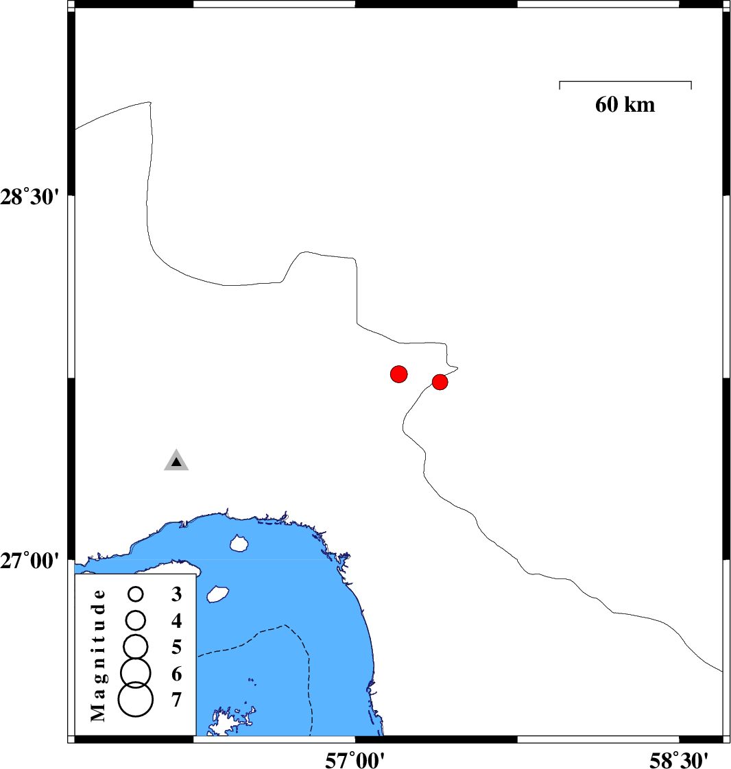 | 2021/04/28 | 05:02:05.0 | 09:32:05.0 | 27.733 | 57.392 | 12 | ML:3.2 | Kerman Province, 37 km North-West of Manujan |