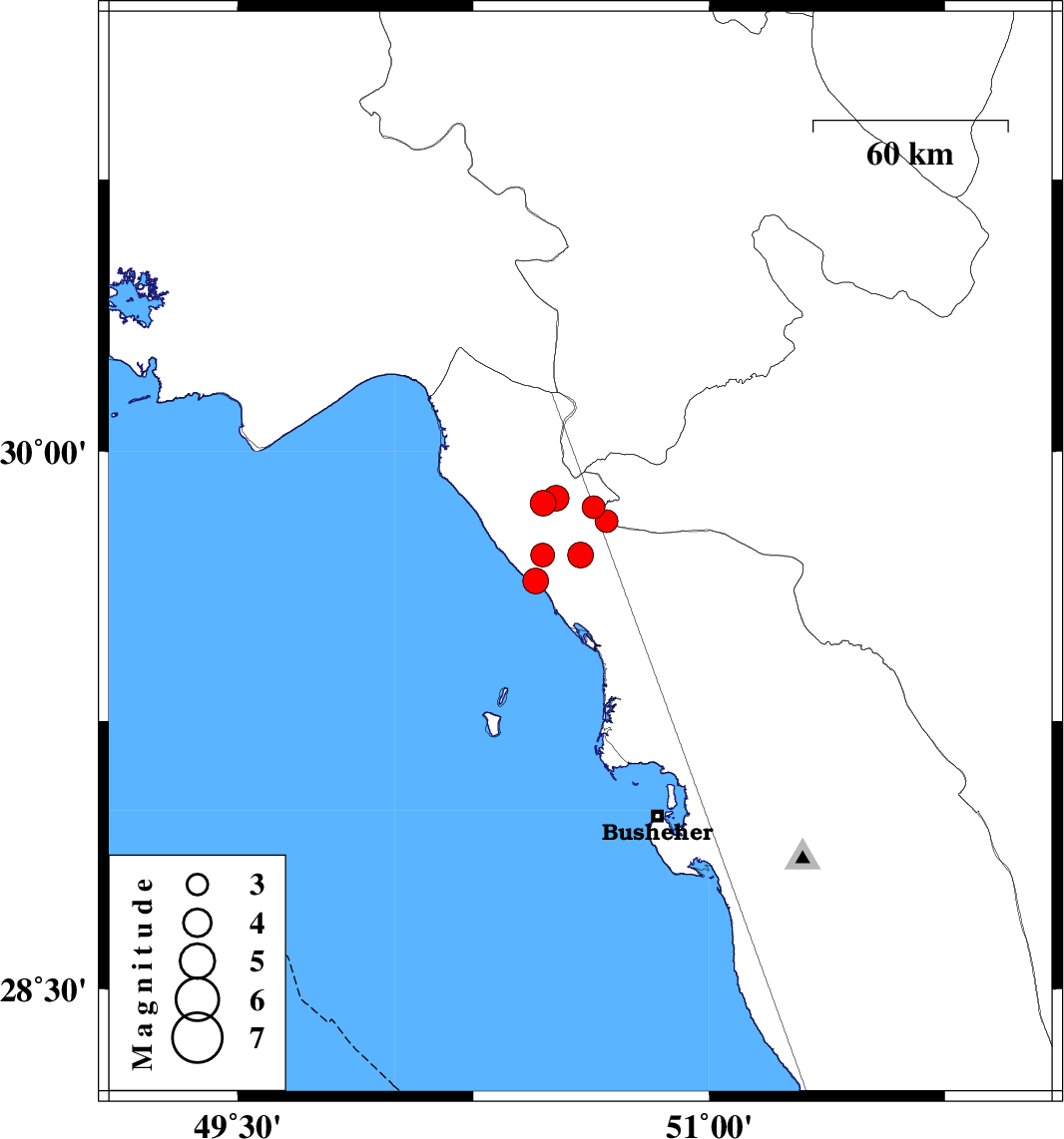 | 2021/04/26 | 15:32:11.8 | 20:02:11.8 | 29.806 | 50.674 | 28 | ML:3.2 | Fars Province, 30 km North-East of Bandar-e genaveh |