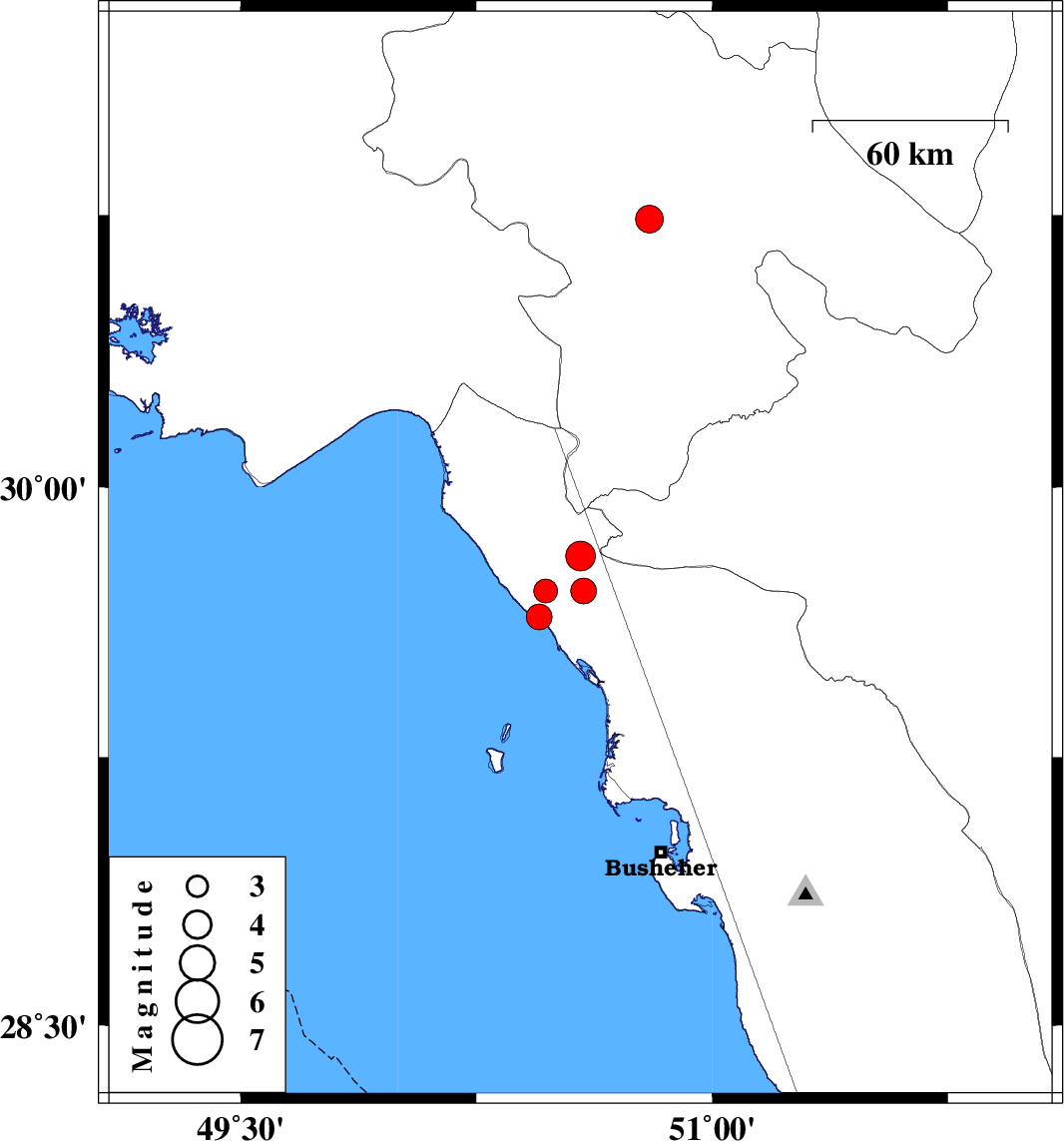 | 2021/05/01 | 19:11:48.9 | 23:41:48.9 | 29.64 | 50.449 | 12 | ML:3.6 | Bushehr Province, 10 km of Bandar-e genaveh |